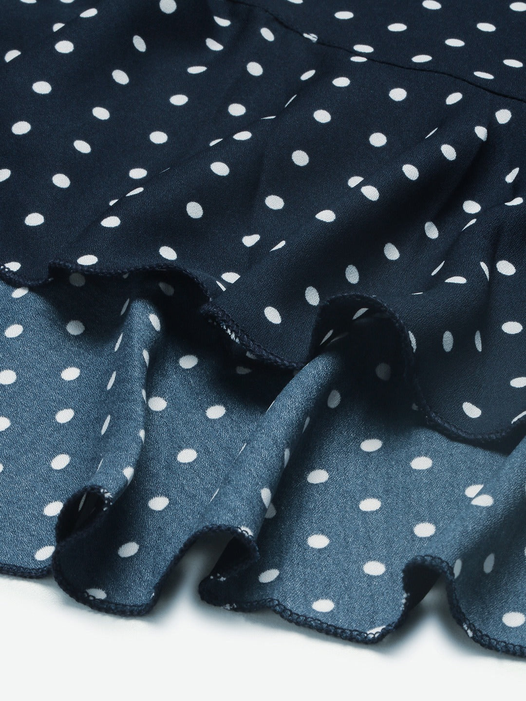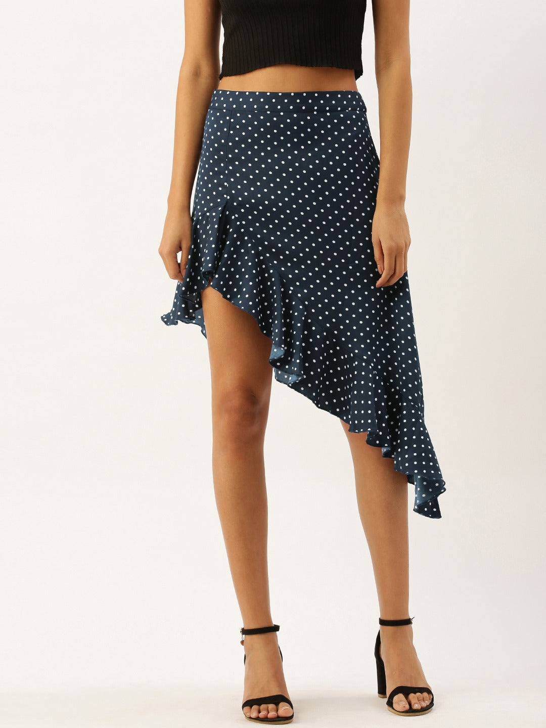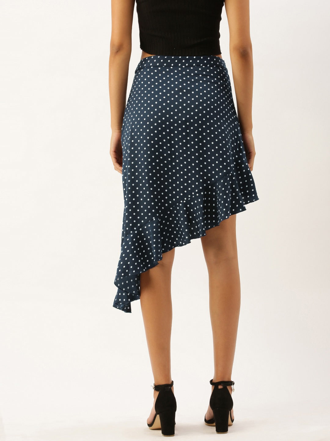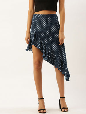 Berrylush Women Navy Blue Polka Dot Asymmetrical Hem Ruffled Skirt