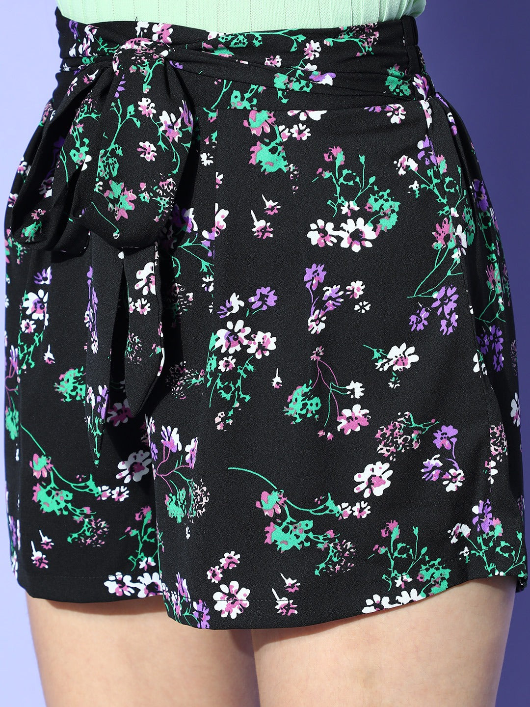 Berrylush Women Black, Green, & Purple Floral Printed Tie-Up High-Rise Elastic Waist Shorts