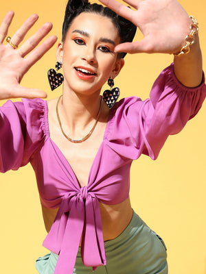 Berrylush Women Solid Lavender Sweetheart Neck Front Tie-Up Crepe Cropped Top
