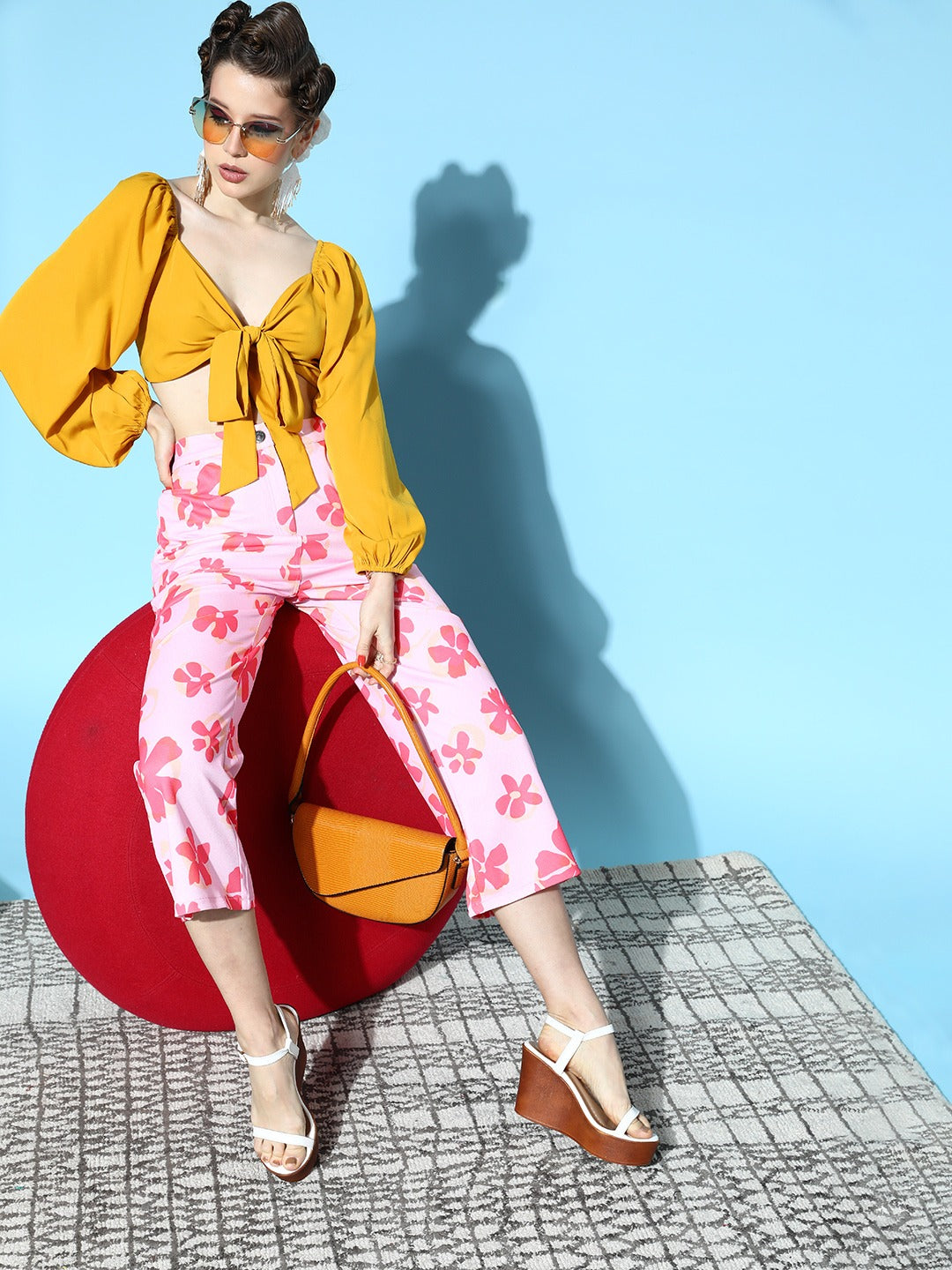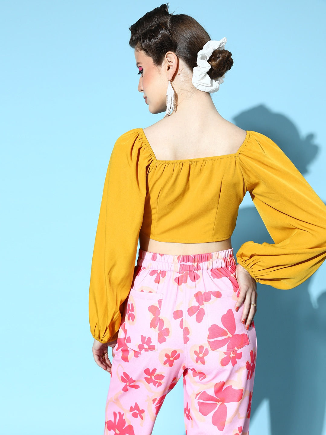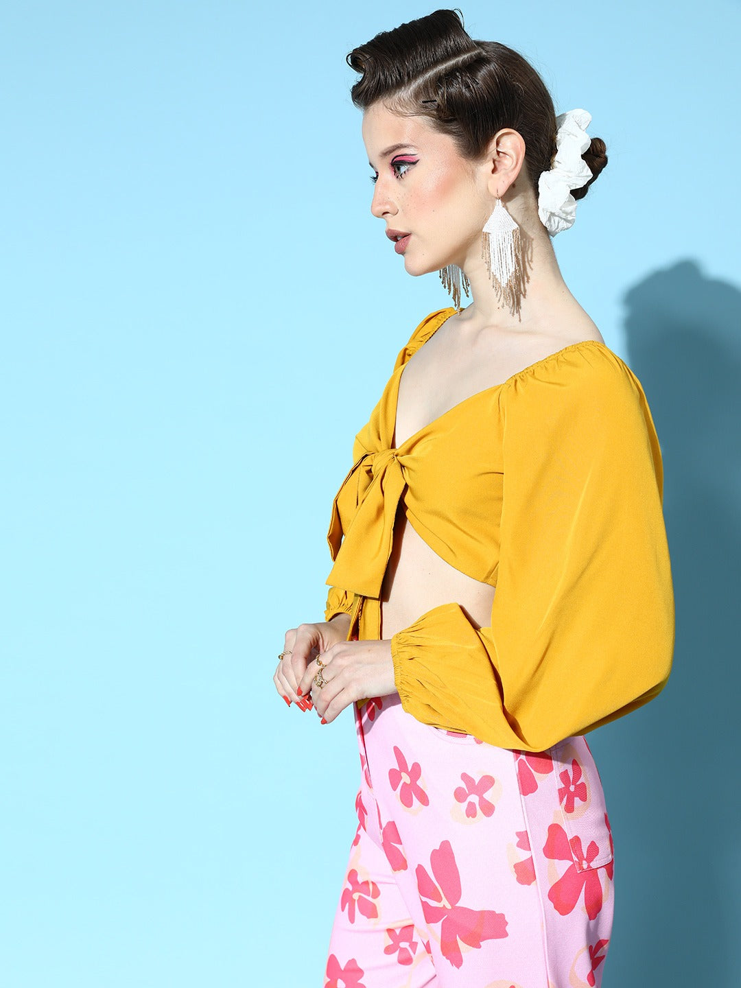 Create the perfect mood with eye-catching style and colours that goes well-acquainted with every moment of life by opting for this captivating Solid Mustard Yellow Sweetheart Neck Front Tie-Up Crepe Cropped Top from Berrylush. You will surely find this top cute yet sexy as it comes in crop length that gives an eccentric appeal to your attractive figure with enticing exposure. Presenting long-puff sleeves that make this top appropriate for every season and weather condition by lending your arms proper coverage with a volumized style. That's not all, this top comes with woven detailing that enhances the overall structural integrity of this top with a smart sheen. Fashion up this wrap crop top with high-waist trousers, fun tassel earrings, and a colour-block style handbag to create an enchanting look.