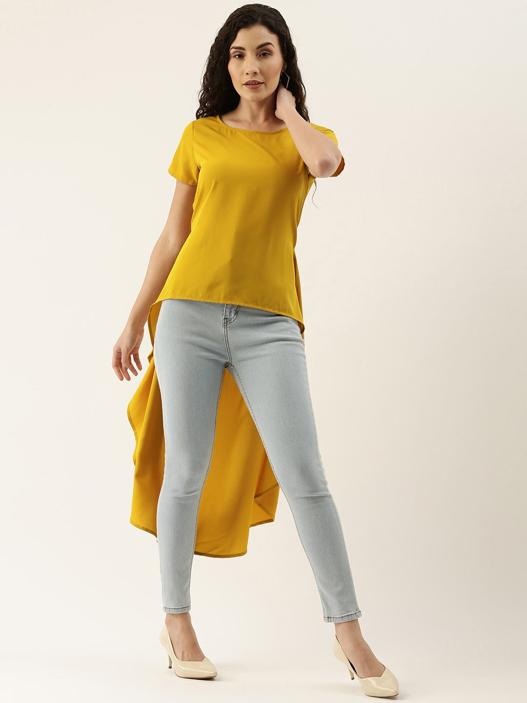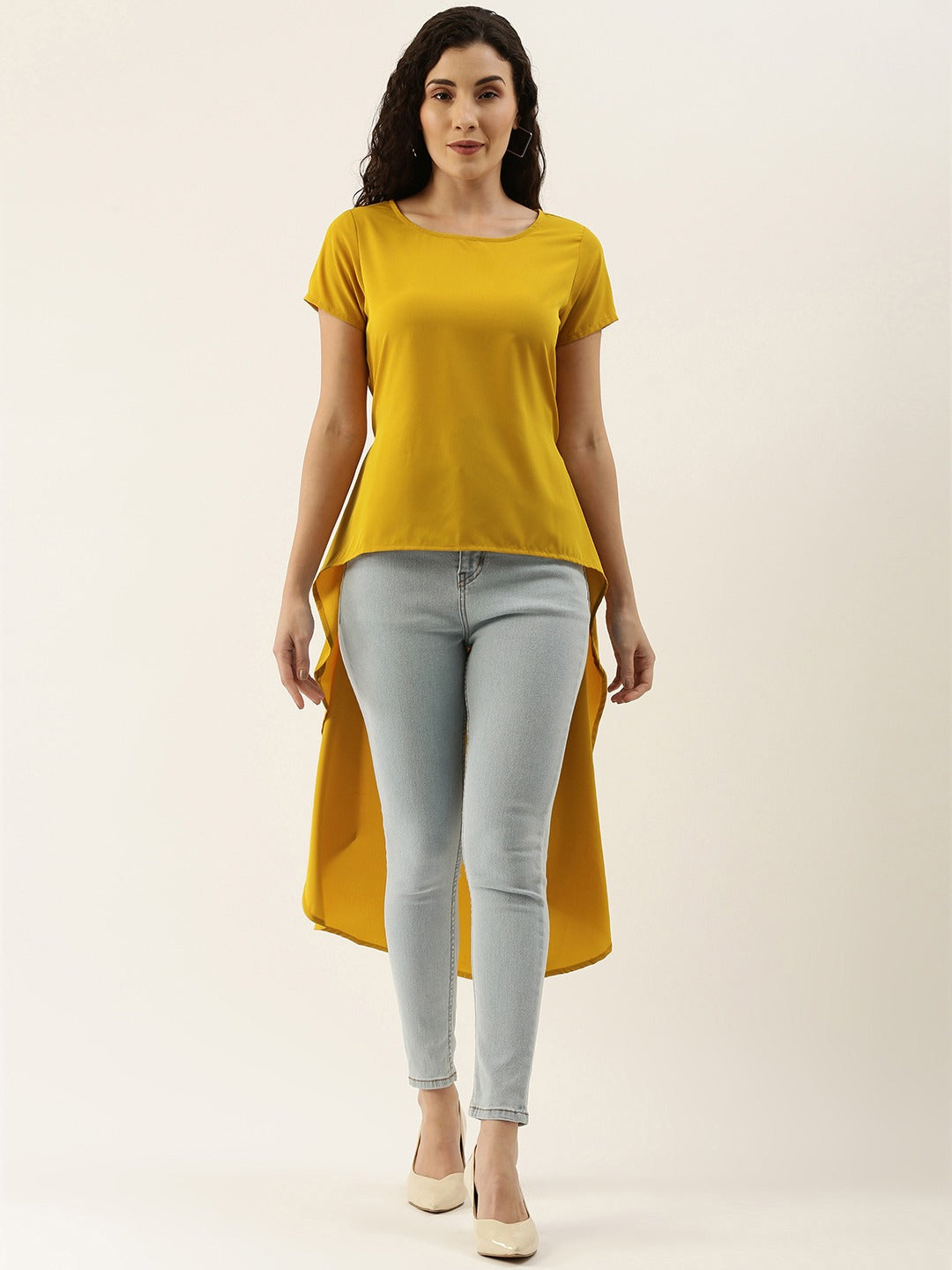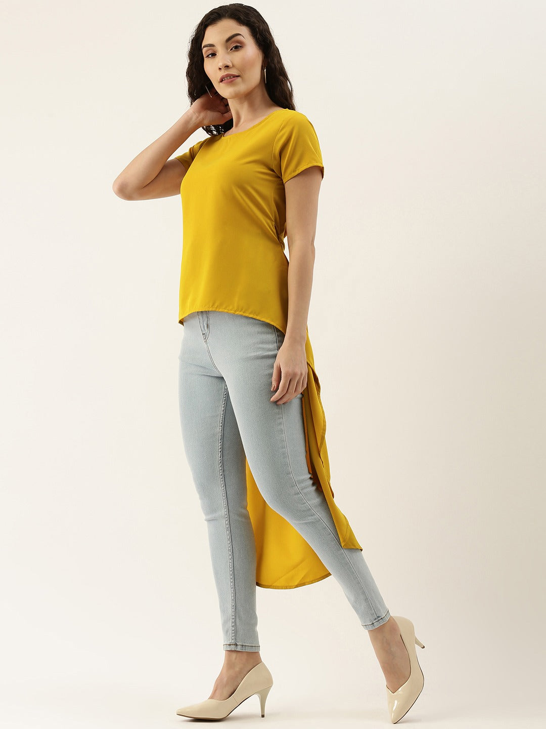 Yellow is the new love' when you wear this Solid Yellow Crepe Waist Tie-ups High-Low Top from Berrylush. This cheerful yellow top comes with a simple regular design but sets your overall appearance to the next level. The short regular sleeves look very charming and also put a youthful element to your arms. With solid yellow colour, this top looks attractive and cheerful throughout the day. The round neckline makes your torso become fuller and appear more appealing and the longline asymmetric detailing feels a funky tone to your moves. The polyester fabric helps you to stay comfortable while you make move. Match this top with slim-fit leggings and high heeled stilettos for a stunning look. And bring style to your wardrobe with this high-low top from Berrylush.