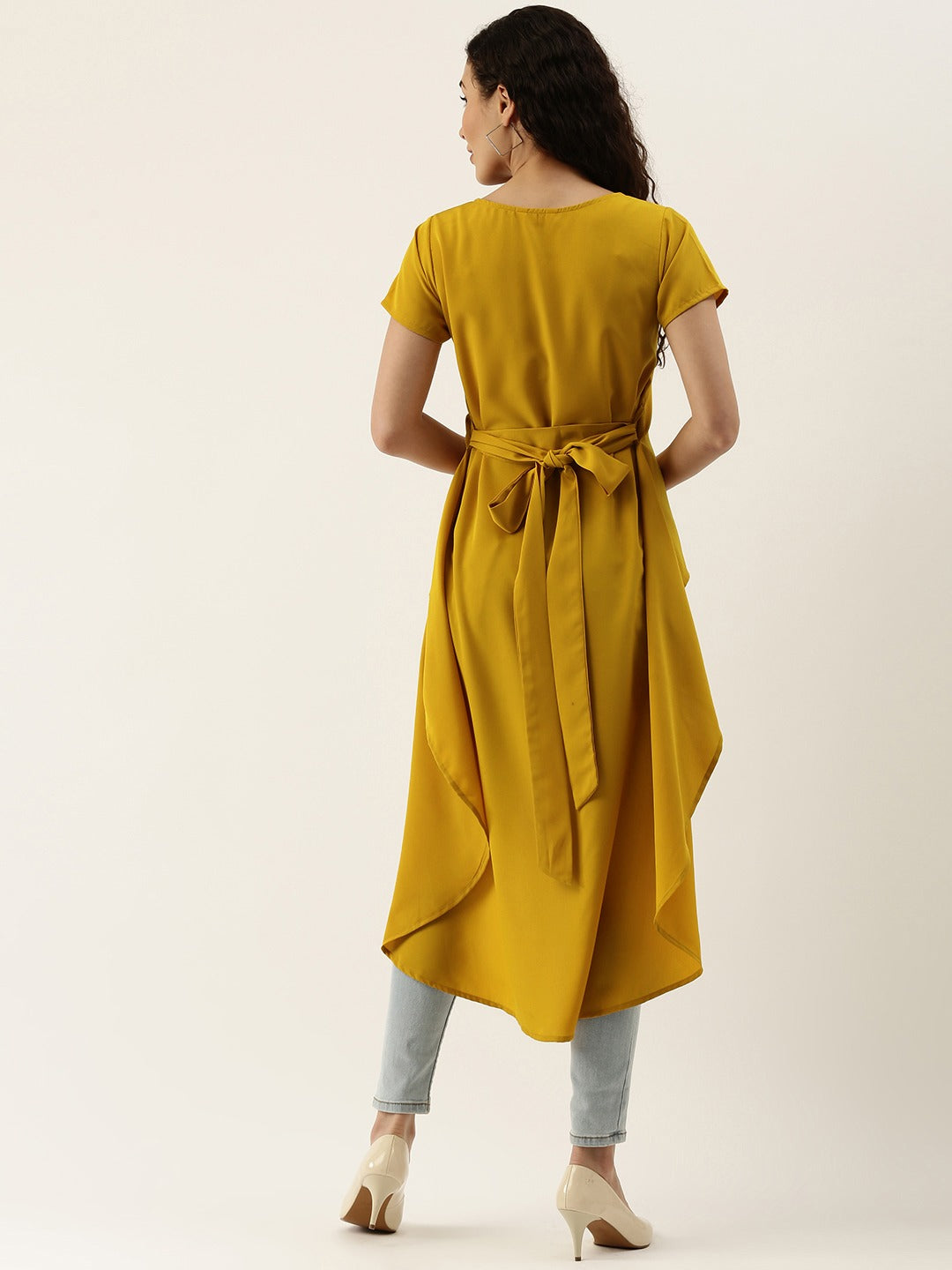 Berrylush Women Solid Yellow Crepe Waist Tie-ups High-Low Top
