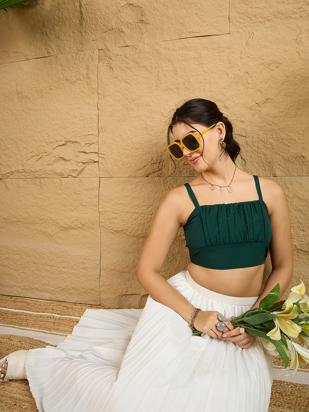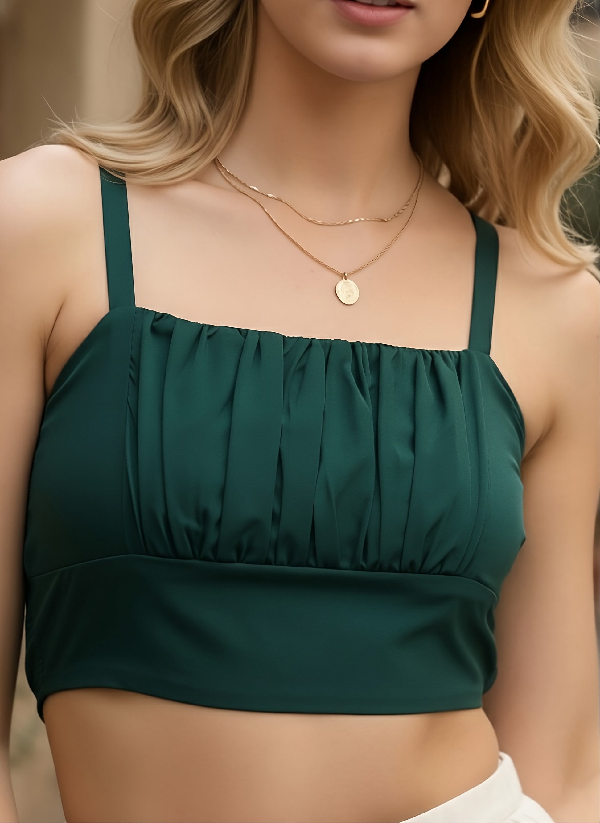 Berrylush Women Solid Green Square Neck Sleeveless Smocked Back Pleated Crop Top