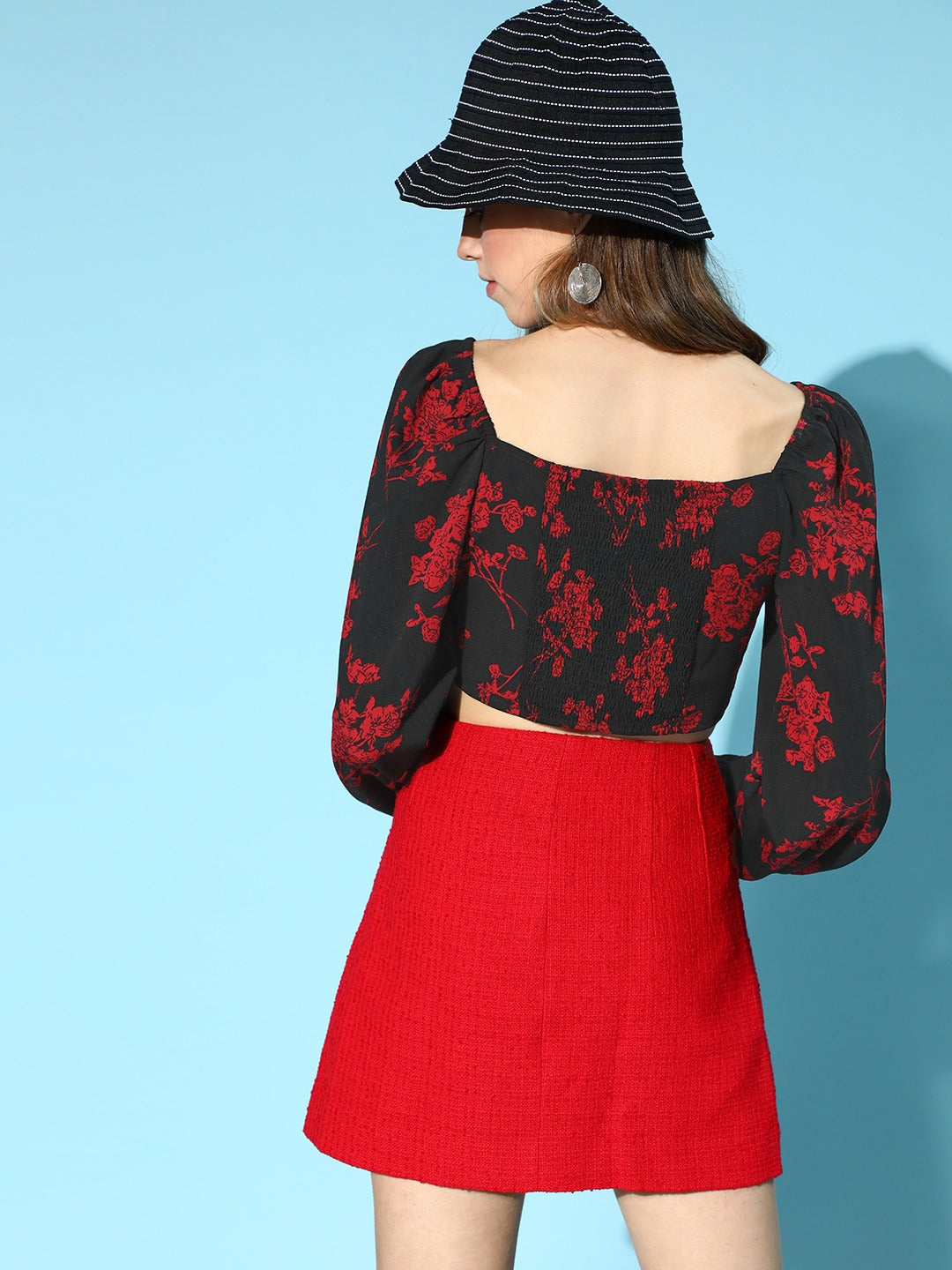 Berrylush Women Black & Red Floral Printed Sweetheart Neck Front Tie-Up Crepe Crop Top