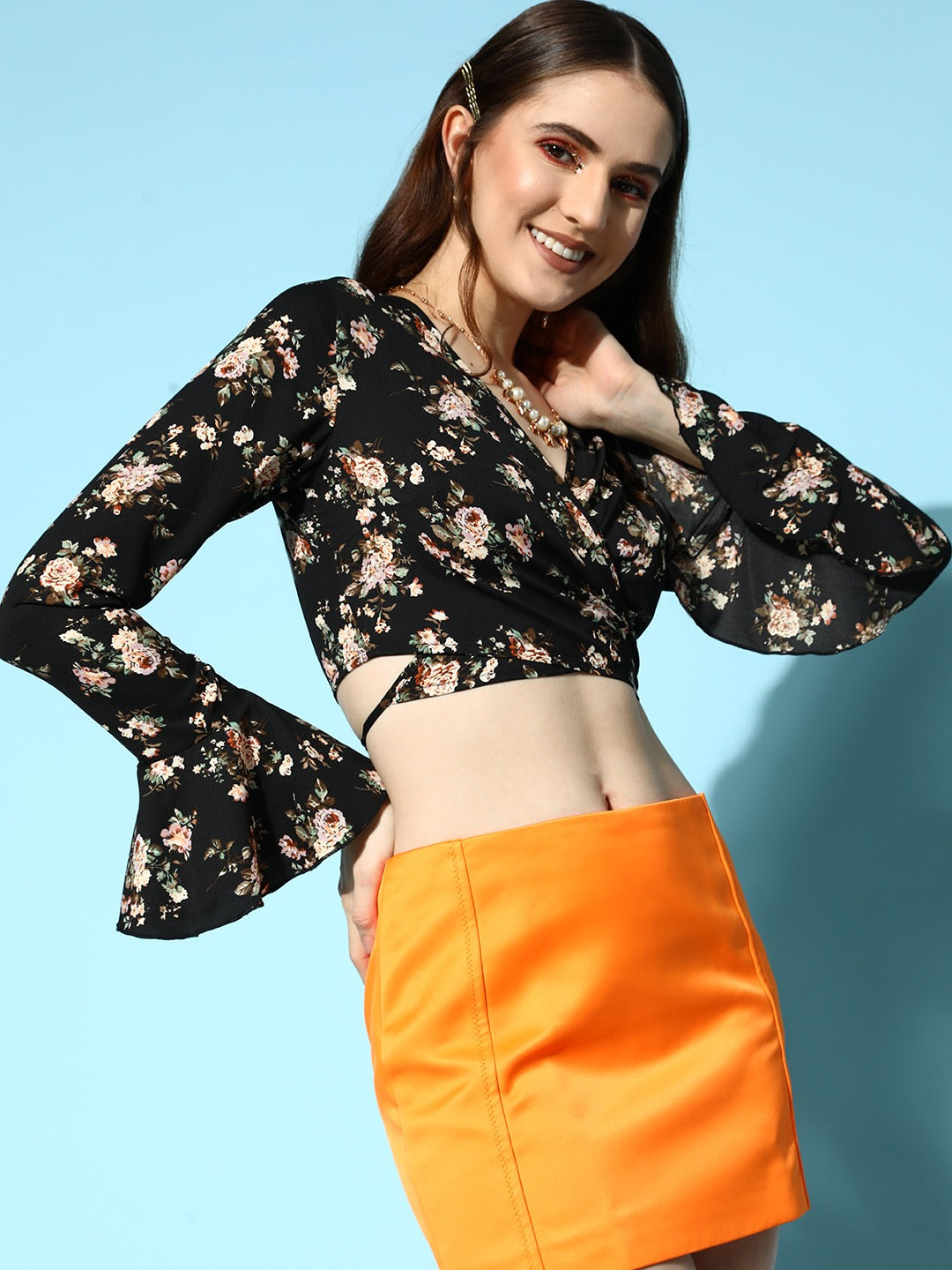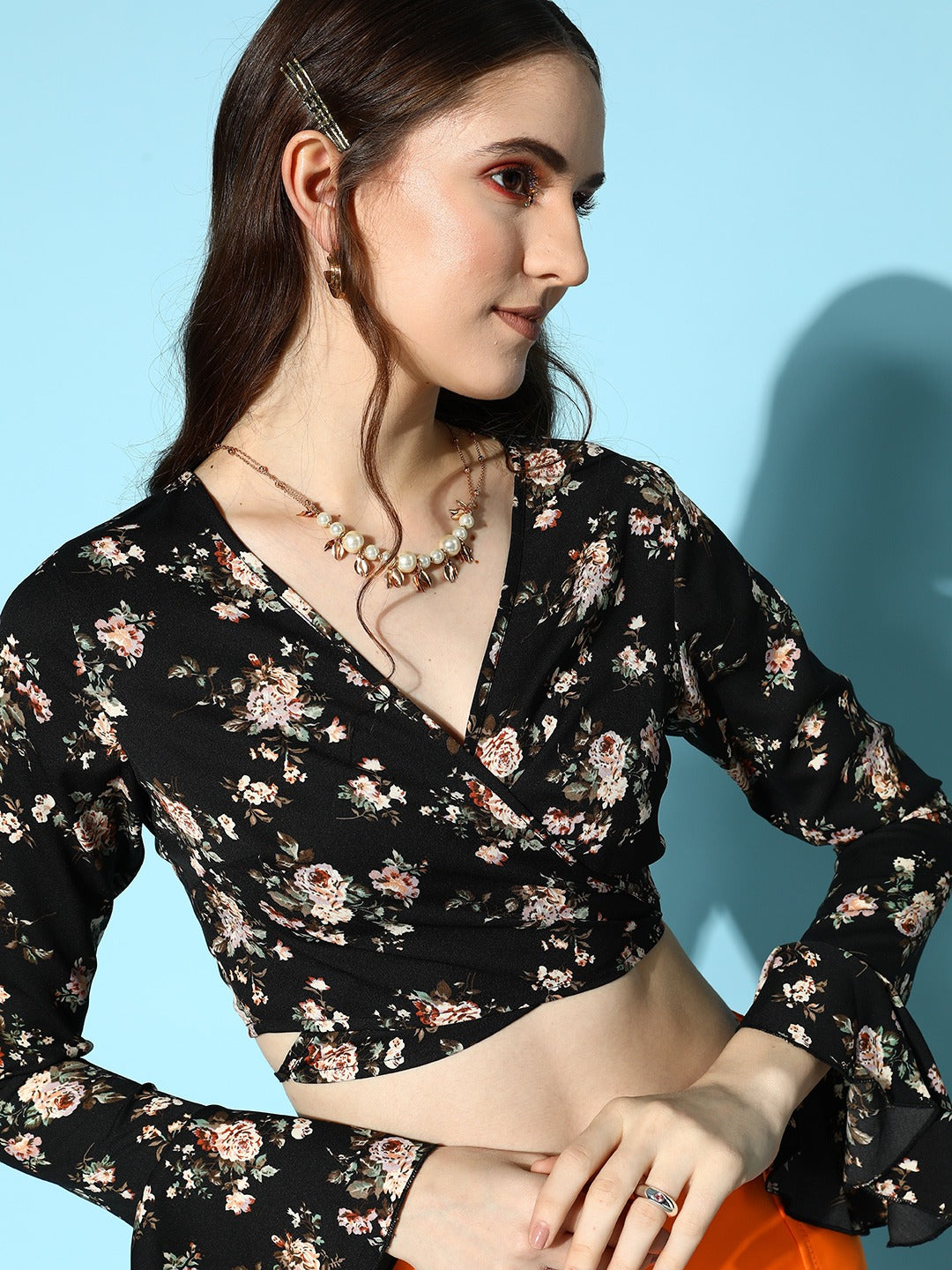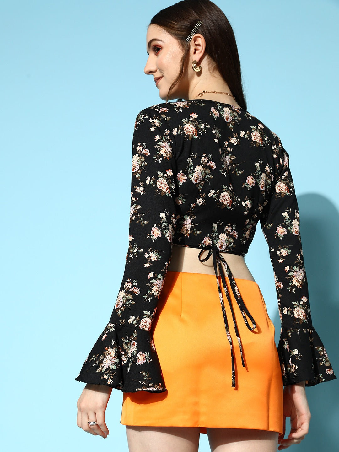 Berrylush Women Black & Cream Floral Printed V-Neck Waist Tie-Up Back Crepe Wrap Cropped Top
