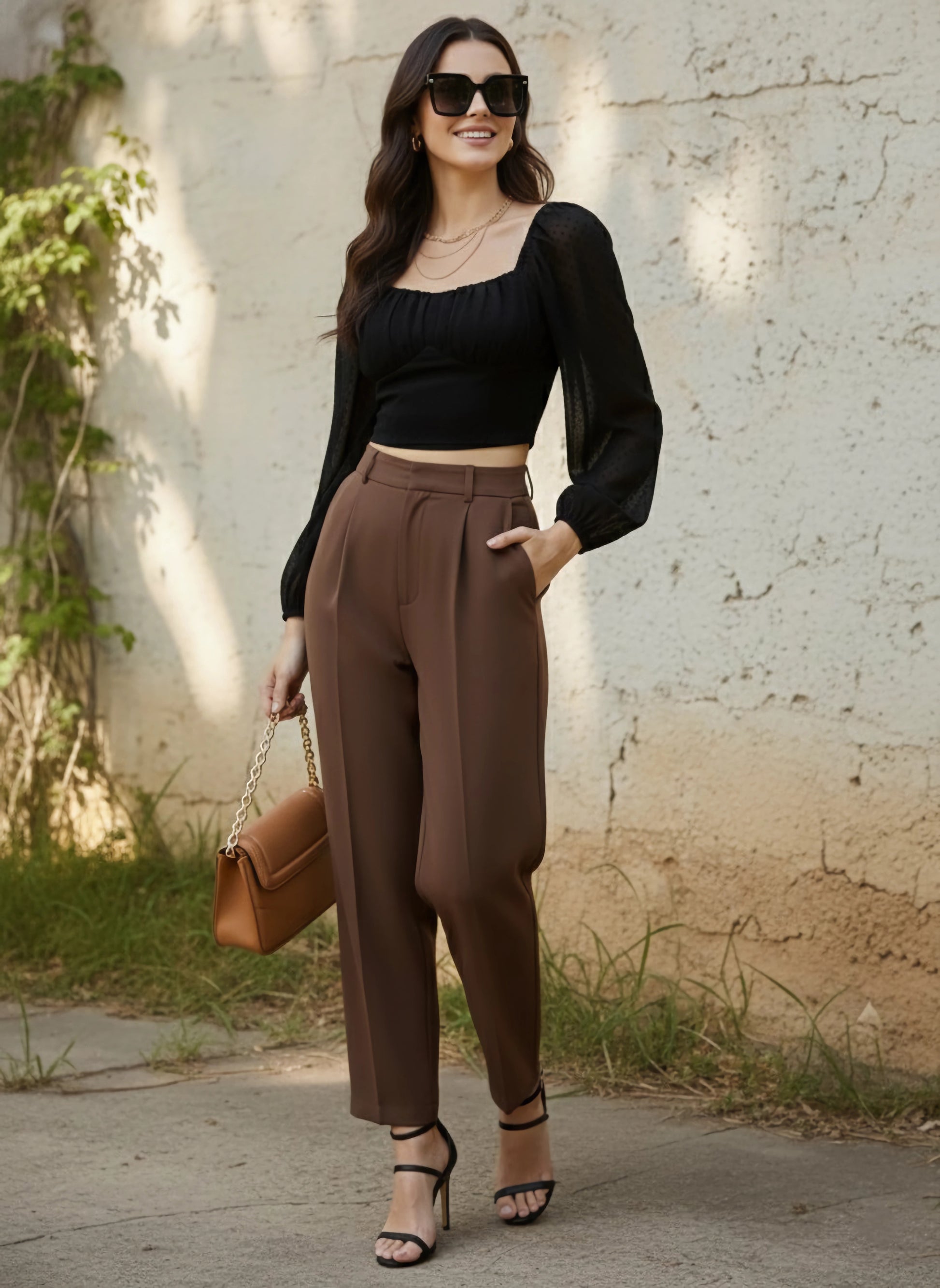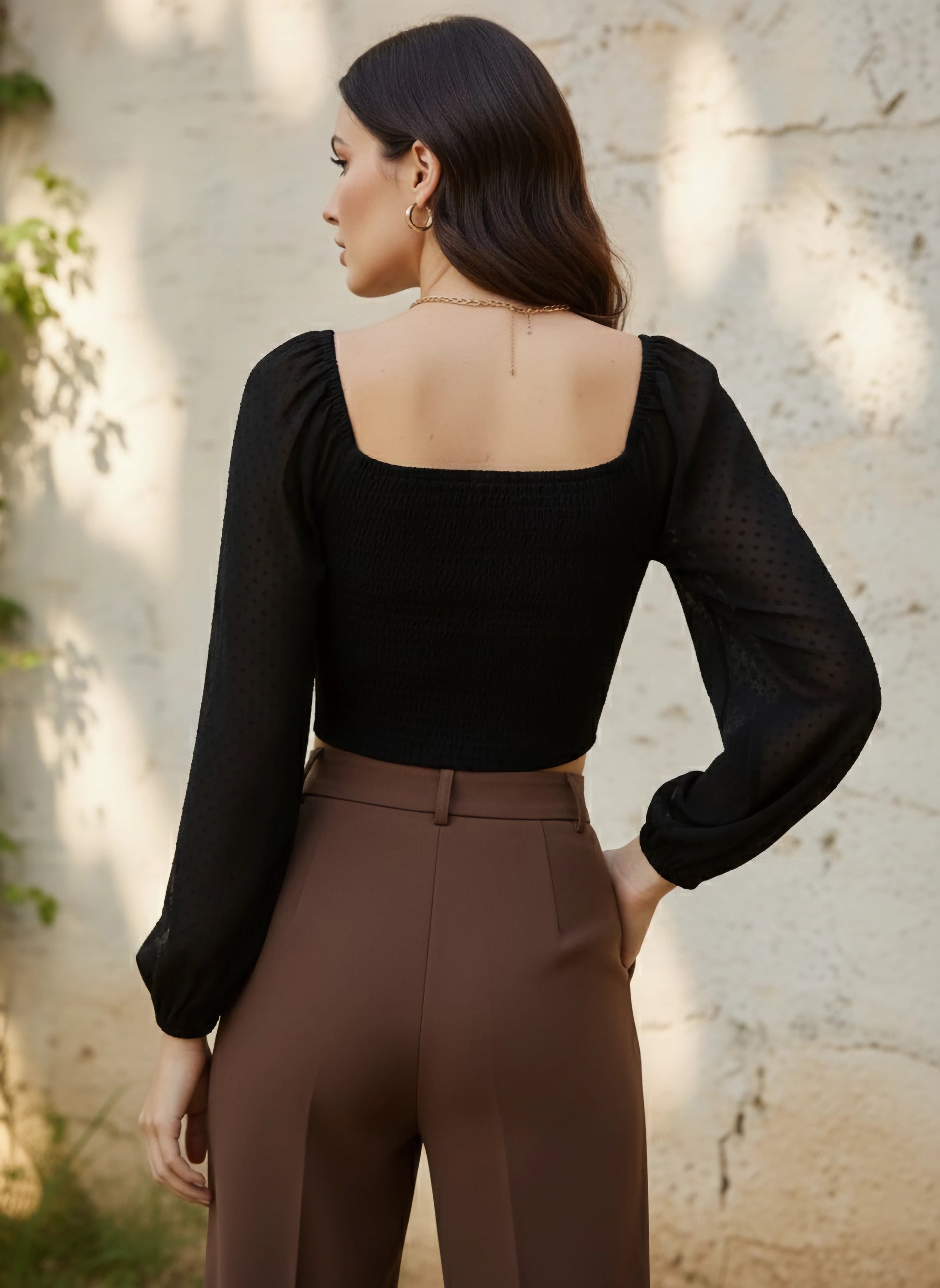 If your style is focused on comfort, versatility, and distinctive design then this bedazzling Solid Black Dobby Weave Sweetheart Neck Puff Sleeve Crepe Smocked Crop Top from Berrylush is meant for your capsule closet. Styled with attached lining that lends this top extra warmth, luxury notes and helps to avoid see-through issues. Presenting long-puff sleeves that lend your arms a volumize appeal with an amalgam of retro style with an urban twist. Features crop length of the top that keeps your body ventilated and fresh with an enticing appeal to your waist. Team up this crop top with your favourite skirt, ombre-style sunglasses, pearl jewellery, a pair of black high-heels, and a trendy side bag to create a stunning look.