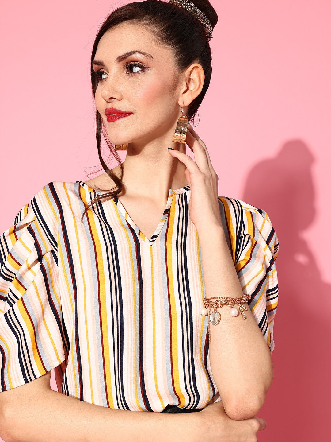 Berrylush Women Pink & Mustard Yellow Striped Pattern Collar Neck Crepe Shirt Top