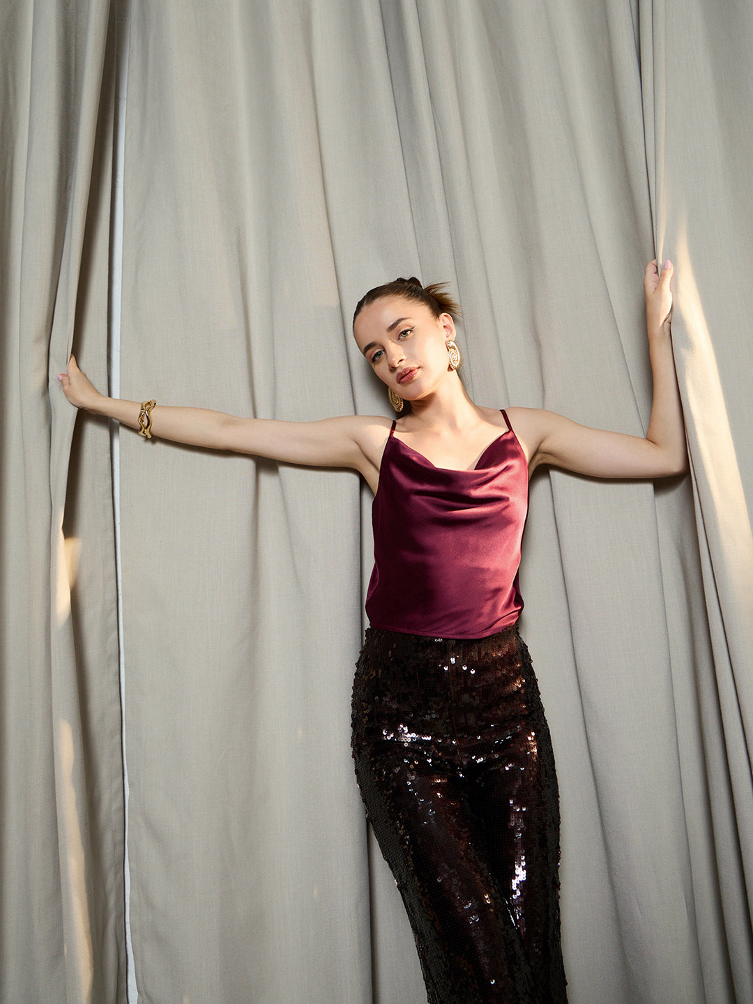 Step into the spotlight with Berrylush's Maroon Cowl Neck Top, a masterclass in effortless elegance. Perfect for any party scene, this top features a seductive cowl neckline and chic sleeveless design that effortlessly blends sophistication with comfort. Crafted from premium woven polyester, it ensures both durability and a soft touch against your skin. The adjustable straps provide a customizable fit, making it as flattering as it is comfortable. Its solid maroon colour exudes rich warmth that pairs superbly with any ensemble—slip-on simplicity at its finest! Look no further for an opaque garment to express your exquisite taste and charm.