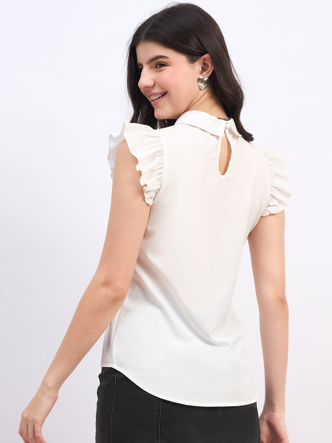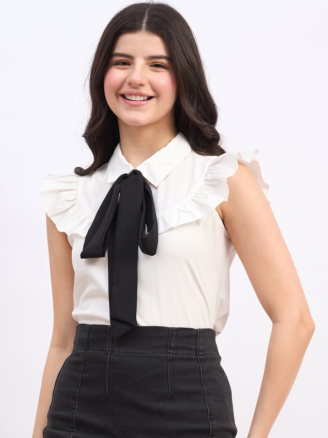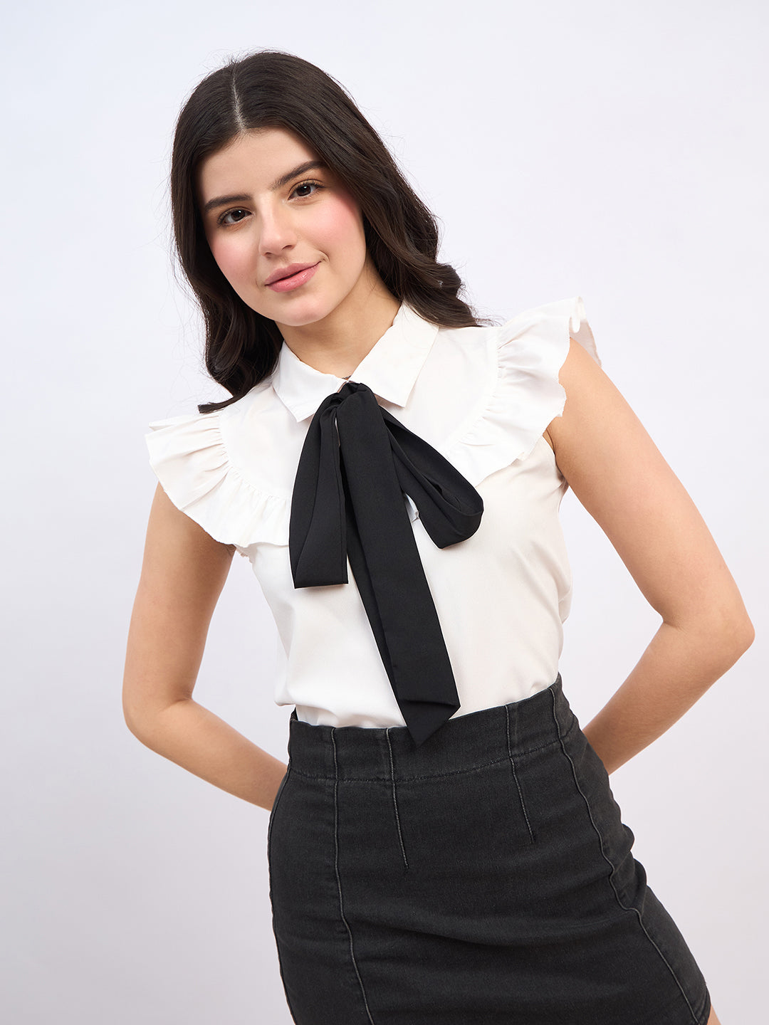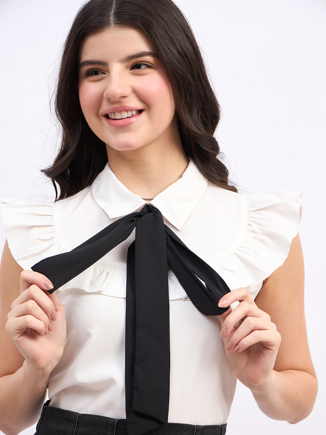 Berrylush Women Solid White & Black Tie-Up Neck Sleeveless Back Keyhole Curved Hem Ruffled Regular Top