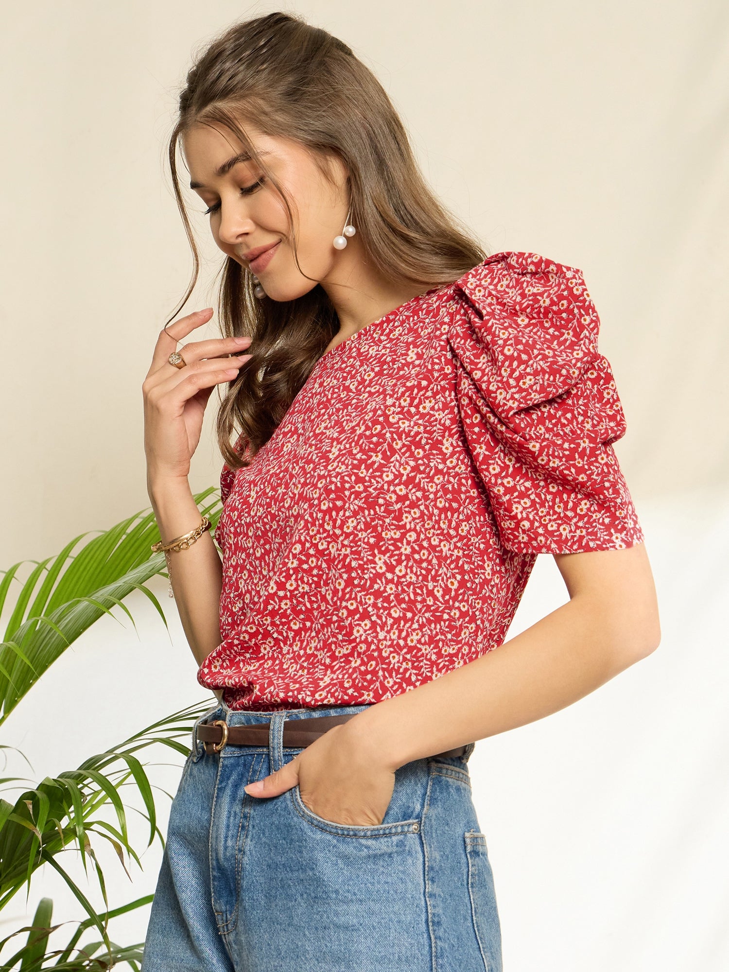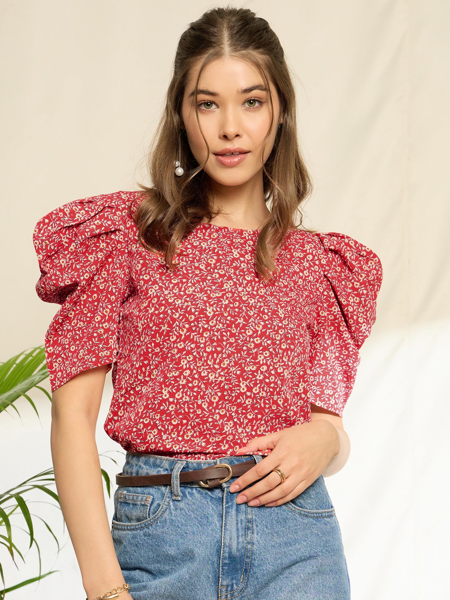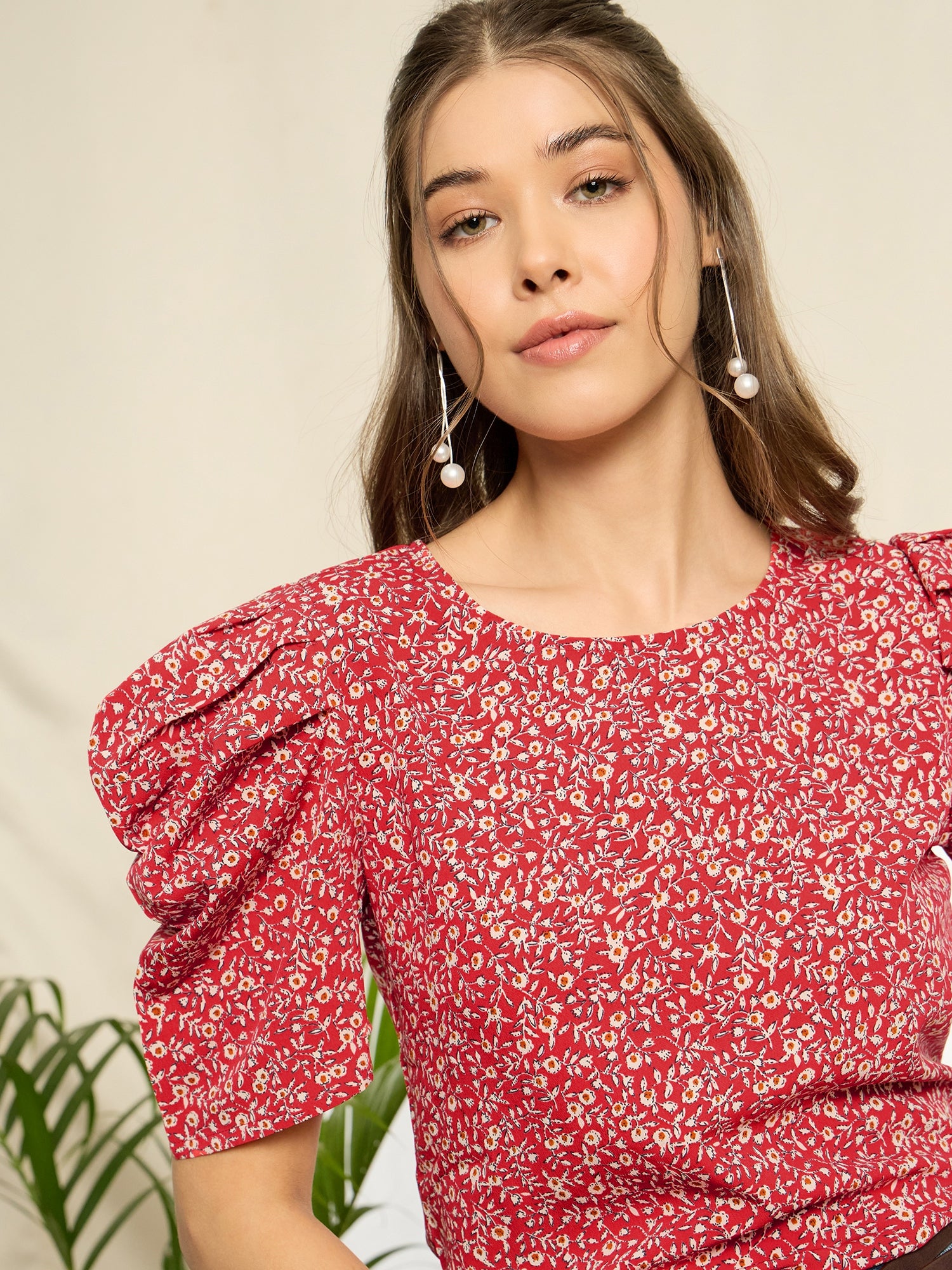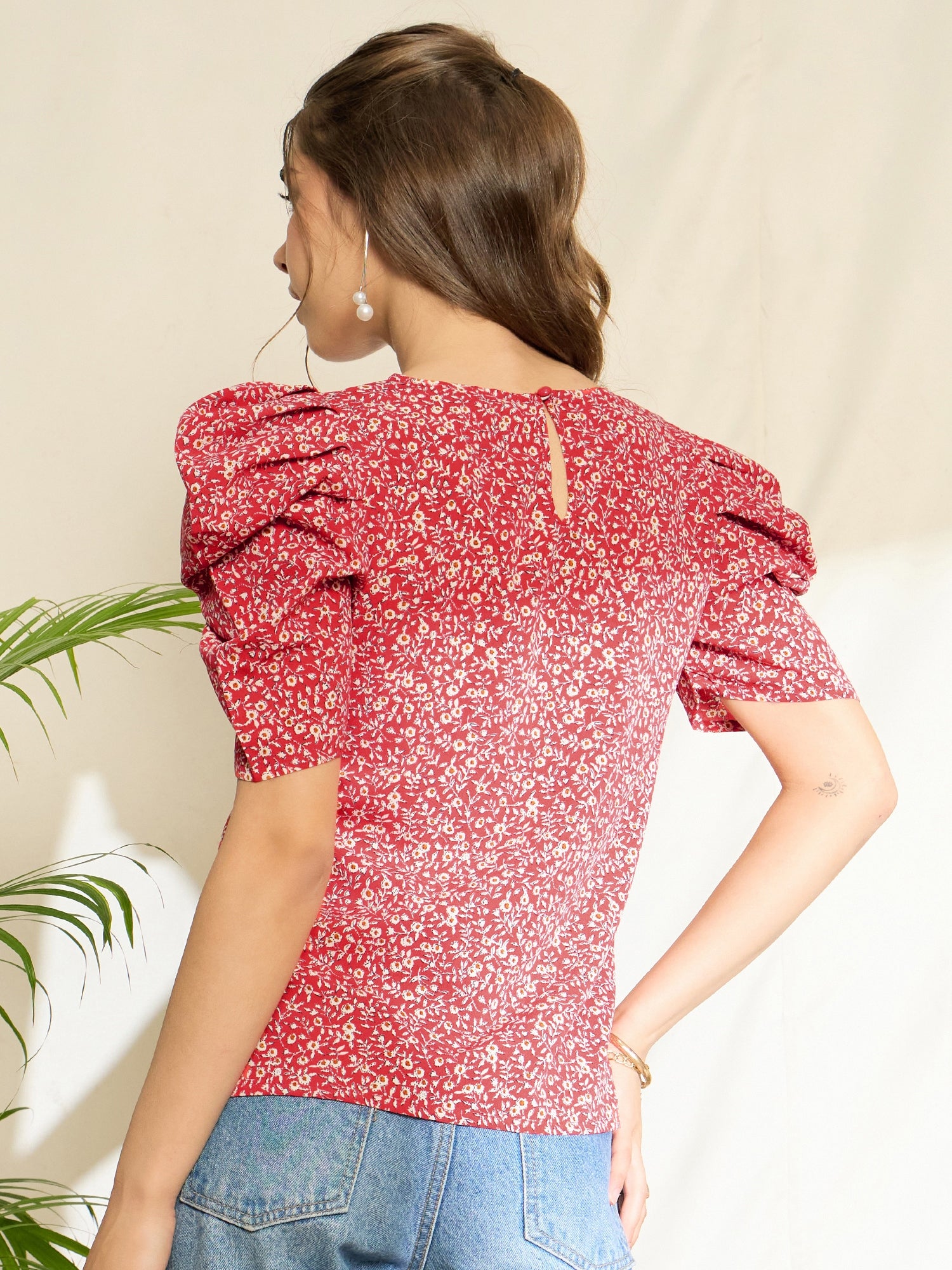 Berrylush Women Red & White Floral Printed Round Neck Puff Sleeves Back Button-Up Keyhole Regular Top