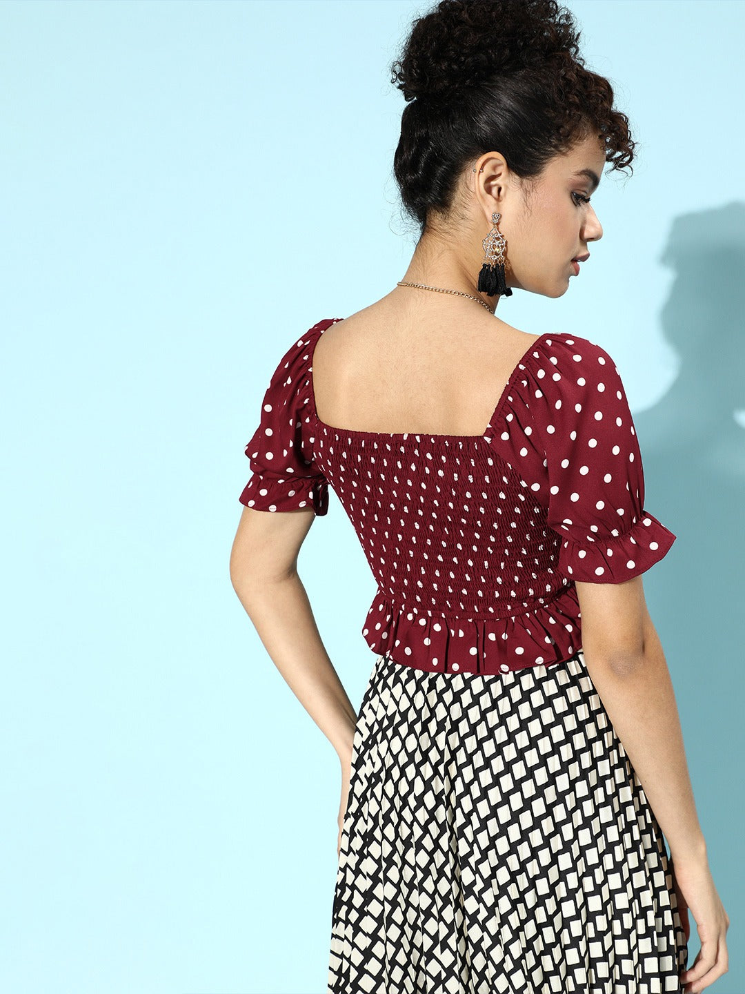 Berrylush Women Red Polka Dot Printed Square-Neck Crepe Smocked Crop Top