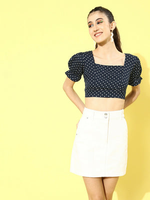 Berrylush Women Navy Blue Polka Dot Printed Crepe Empire Crop Top