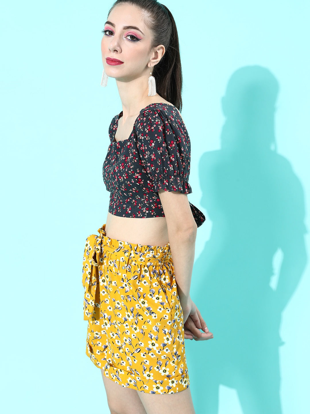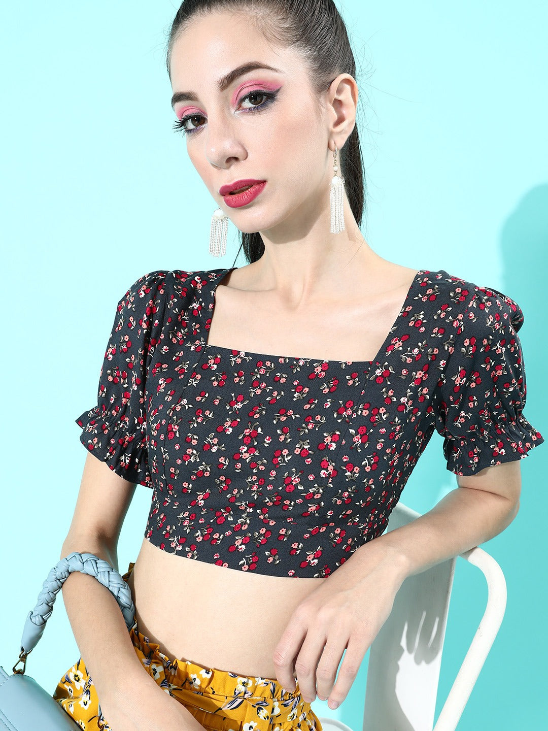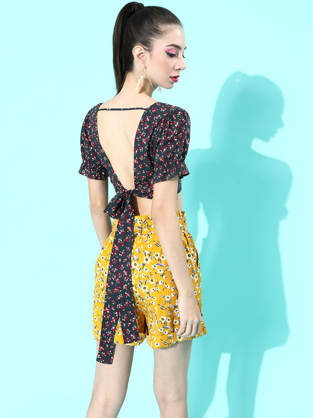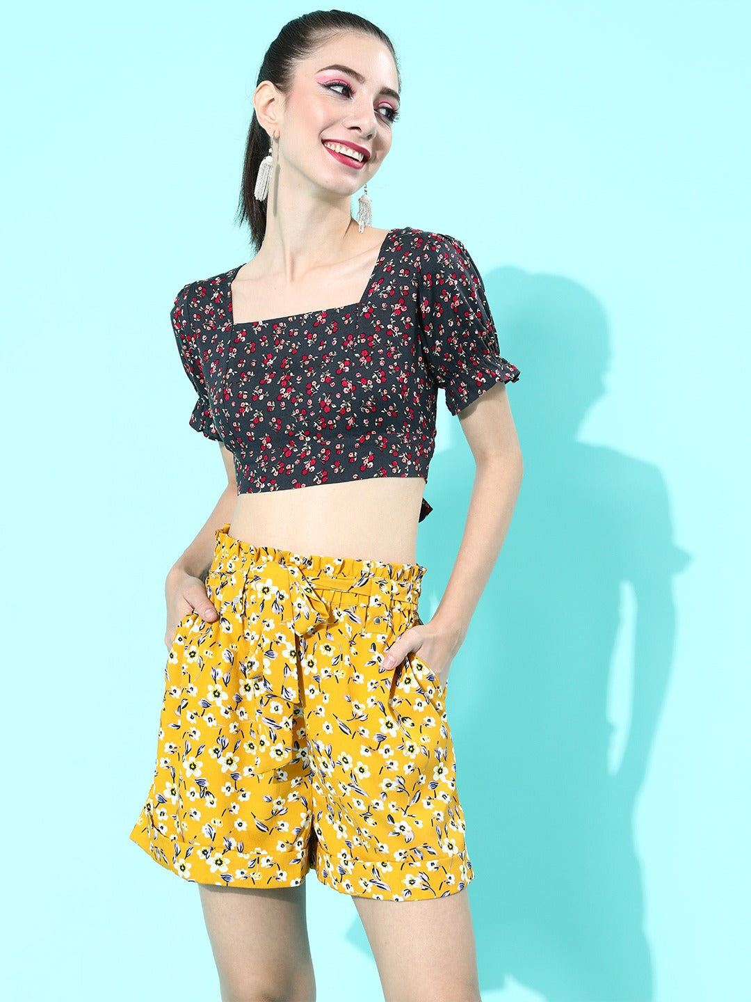 Inflate some vintage and aesthetic vibe to your fall collection this season with this Navy Blue Floral Print Cinched-Waist Crop Top from the floral print collection of Berrylush. Punctuated from crepe polyester fabric to provide breathability and sweat-absorbing features further making a perfect outfit to wear for the prolonged duration on warm days. The cinched waist style of the top gives an hourglass figure and the square neck design adds classic and graceful appeal to your neckline. Short puffed sleeves assemble a decorative sheen to your arms with constraint-free movement while the tie-up accompanied with cut-out details offers an alluring look to your back with an attractive bow-tie closure illustration. Partner up this mesmerizing crop top with a floral print short, white sneakers, and a trendy handbag to get an enchanting final look.