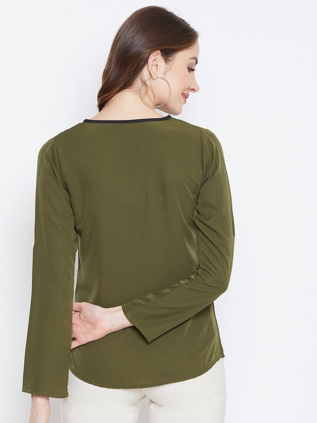 Add a fabulous and fascinating style to your autumn wear collection with this classic Solid Olive Green Collared V-Neck Military-Inspired Shirt Style Top from Berrylush. This shirt lends you a modish and semi-formal appeal with its V-neck and collar design neck which give elegant exposure to your neckline along with a refined sheen. Roll-up and three-quarter sleeves assemble an amusing look to your arms and the shirt-type styling depicts a magnetizing combination of classy and chic appearance. The amazing duo of olive green shade with solid pattern presents a vintage vibe from your casual look and further puts together a military-inspired look. You can step out by wearing this beautiful olive-green top with white formal trousers and high heels to add a graceful charm.