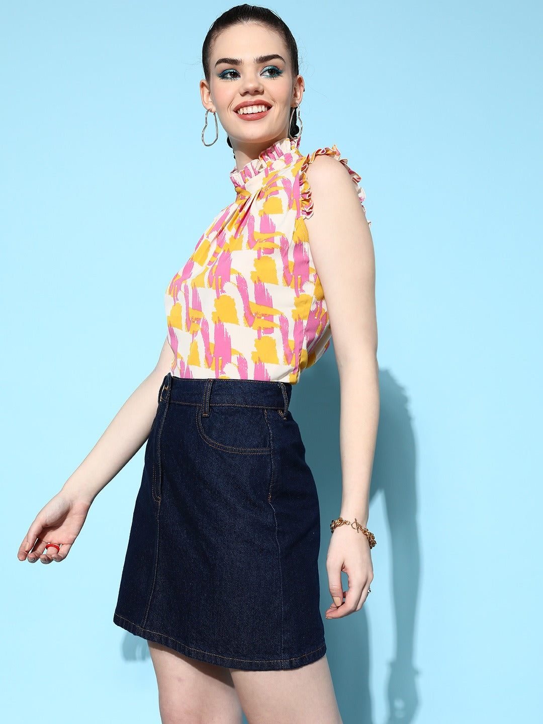 Berrylush Women White & Pink Abstract Printed High neck Sleeveless Crepe Ruffled Top
