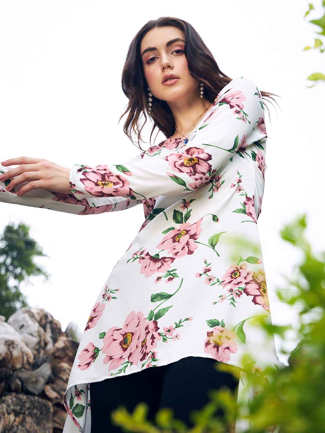 Introducing the latest masterpiece from Berrylush - a stunning fusion of fashion and floral elegance. This White, Pink, & Green Floral Printed Round Neck High-Low Hem Longline Top is a must-have addition to your wardrobe that exemplifies casual sophistication. Crafted with care in high-quality polyester fabric, it features an enchanting floral print spreading across its canvas like a dreamy garden in bloom. The elegant round neckline complements the unique high-low hemline, effortlessly enhancing your silhouette. With long sleeves that offer regular styling and an opaque finish guaranteeing premium comfort and privacy, this woven wonder is perfect for any casual outing where style is key. Elevate your fashion game with this exquisite piece by Berrylush.