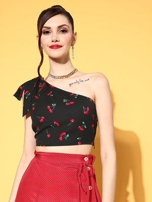 Berrylush Women Black & Red Cherry Printed One-Shoulder Neck Tie-Up Strap Cropped Top