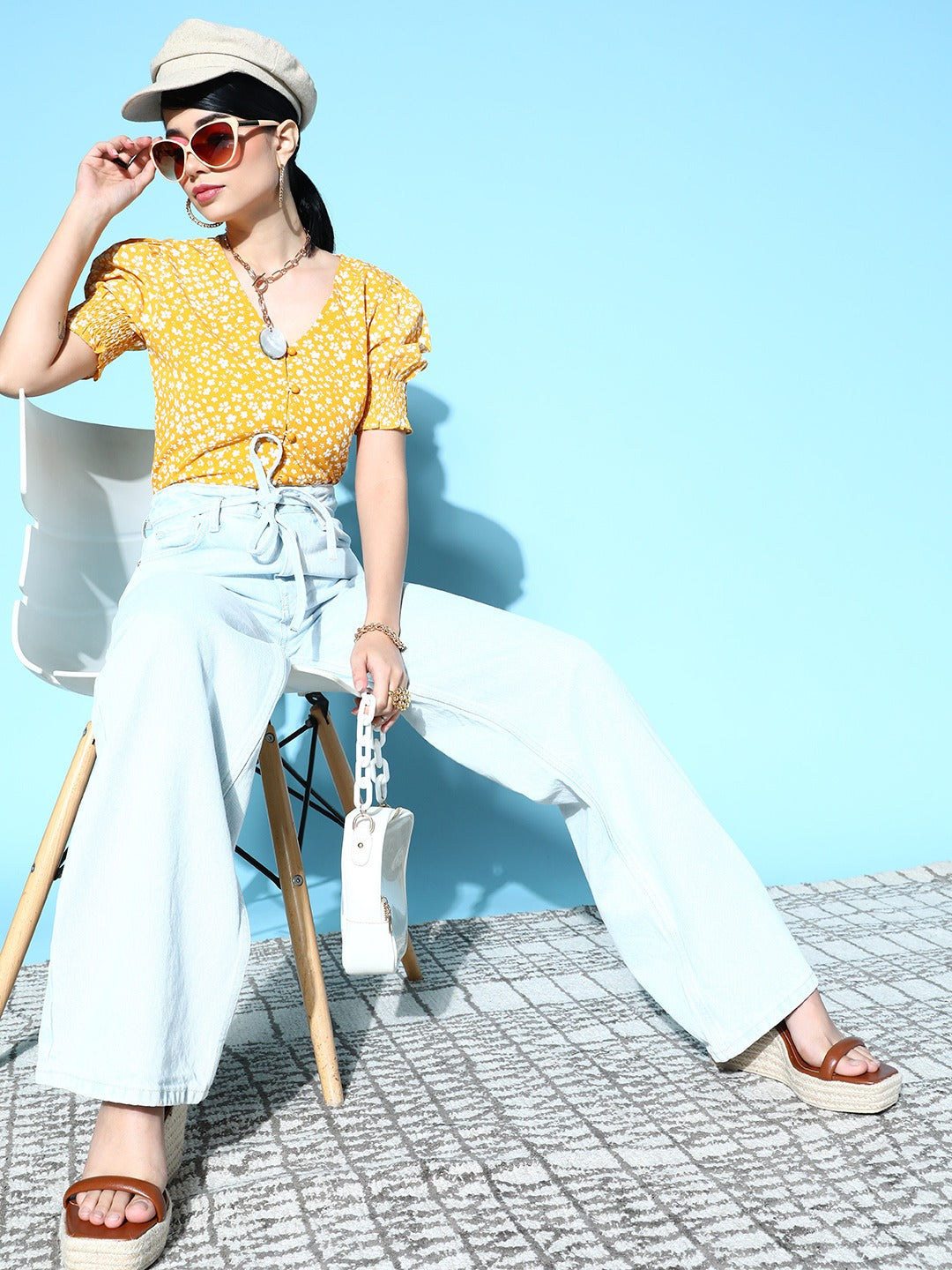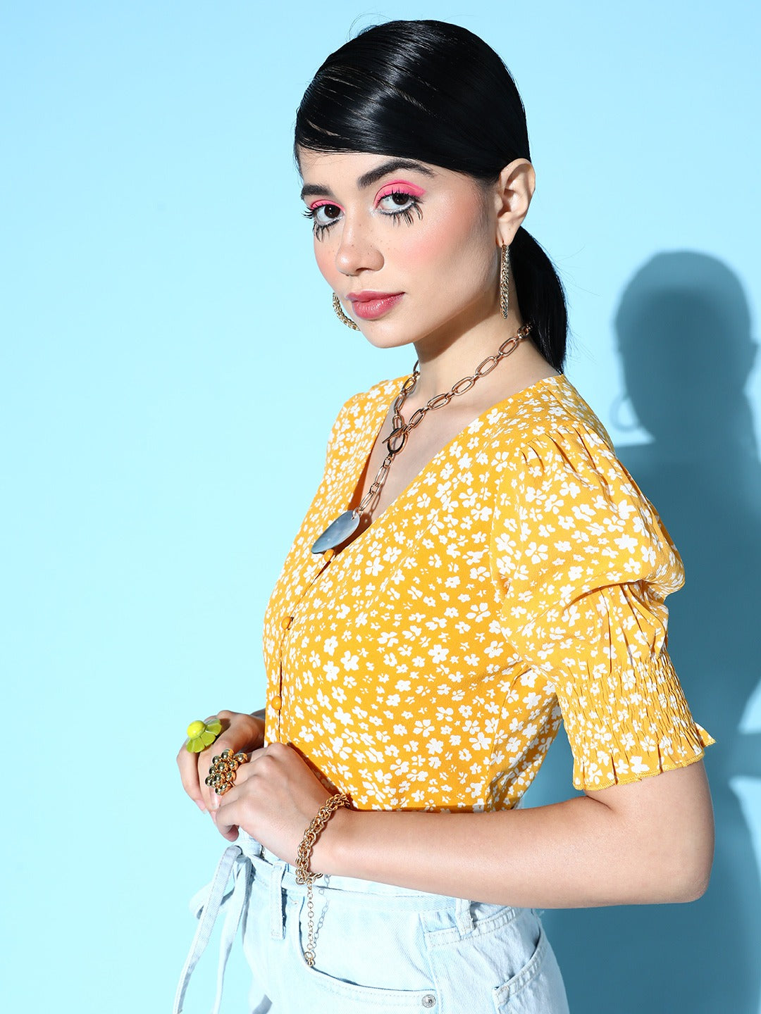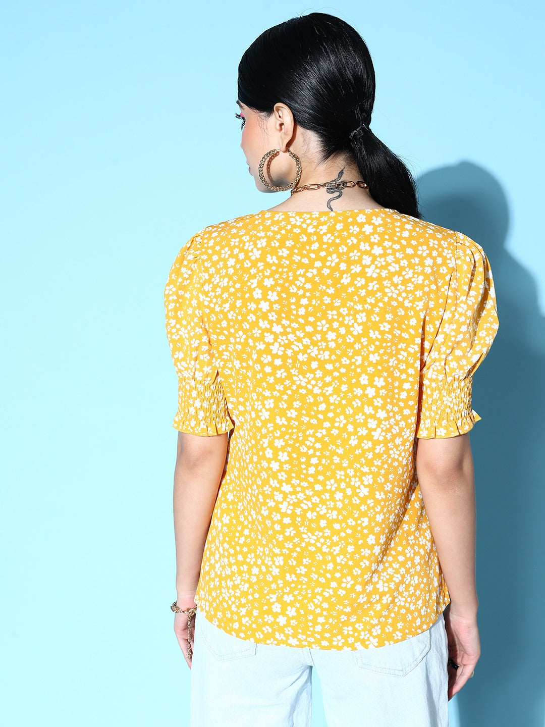 Slay every casual occasion by accompanying yourself with vibrant hues just like this tantalizing Yellow and White Ditsy Floral Print Smocked Crepe Regular Top introduced by Berrylush. The most adorable style element of this top is its V-neck design that elegantly elongates your neckline with a chic definition. Detailed with a button closure that gives the top a practical touch for easy and quick fastening along with a decorative sheen. Moreover, the woven detailing offers an irritation-free touch to your skin with enhanced durability. Partner up this top with white trousers, cute wedges, cute stud earrings, and a matching handbag to create a bewitching look.