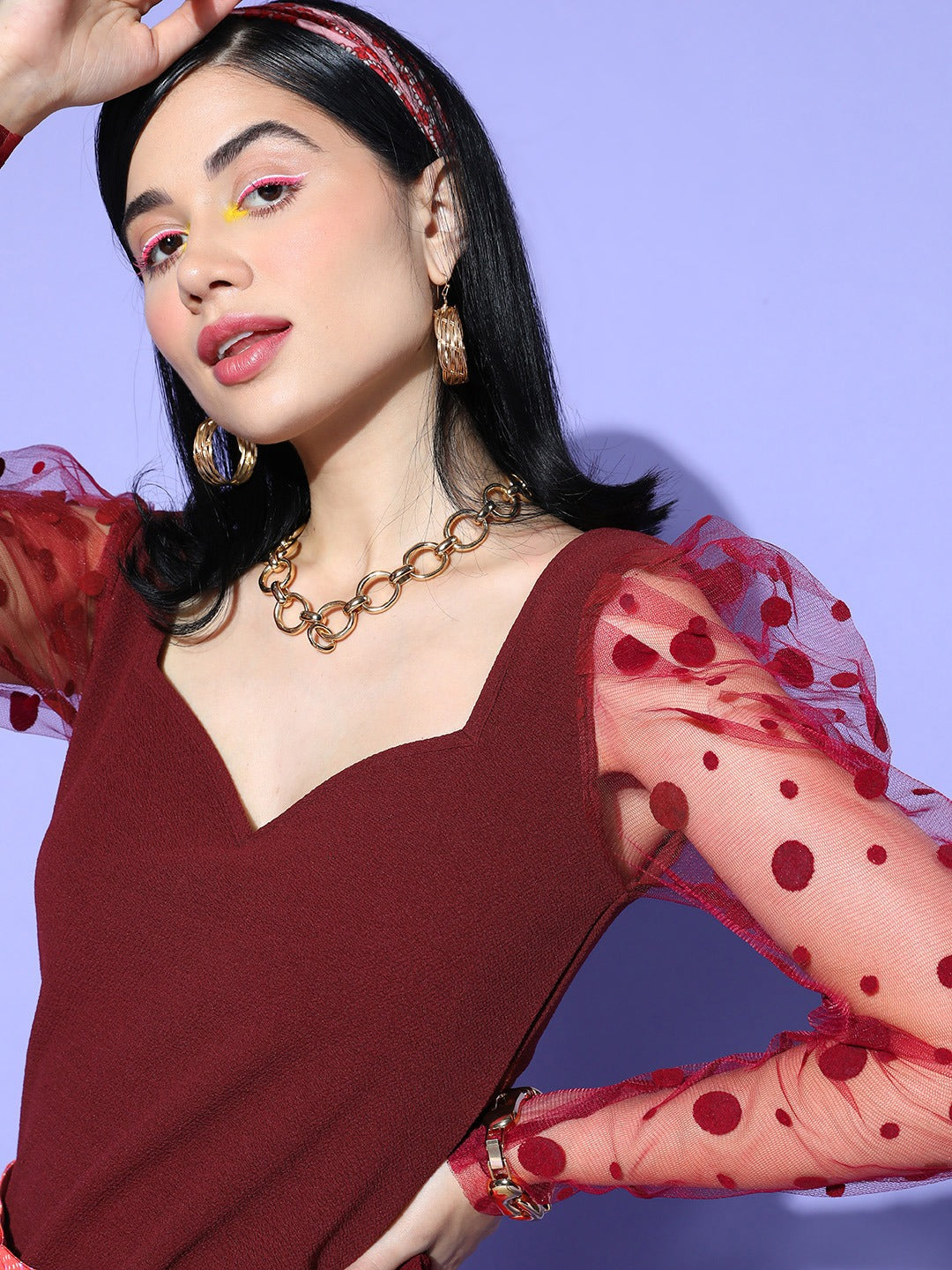 Berrylush Women Solid Maroon Sweetheart Neck Puff Polka Dot Sleeve Crepe Knitted Regular Top