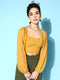 Add a tinge of subtle drama and chicness to your fusion closet by selecting this majestic Solid Mustard Yellow Dobby Weave Knitted Crop Top from the latest casual wear collection of Berrylush. Decorated with pleated surface styling that lends this top a voluminous look with smocked detailing and elasticity. Designed with concealed zip closure to offer easy, quick, and secure fastening with a comfortable fit. Also, the knitted detailing ensures irritation-free touch to your skin with a soft texture and excellent breathability. Complete your look flawlessly for your next outing by teaming it up with a mini skirt, a pair of block heels, golden earrings, and a matching sling bag.
