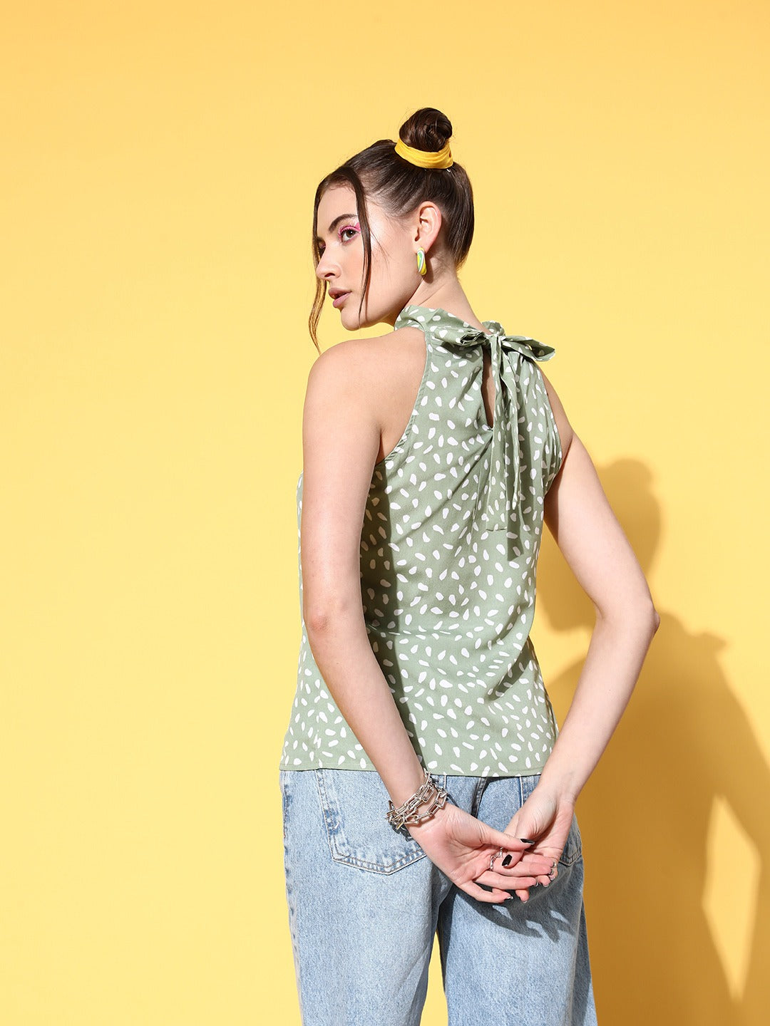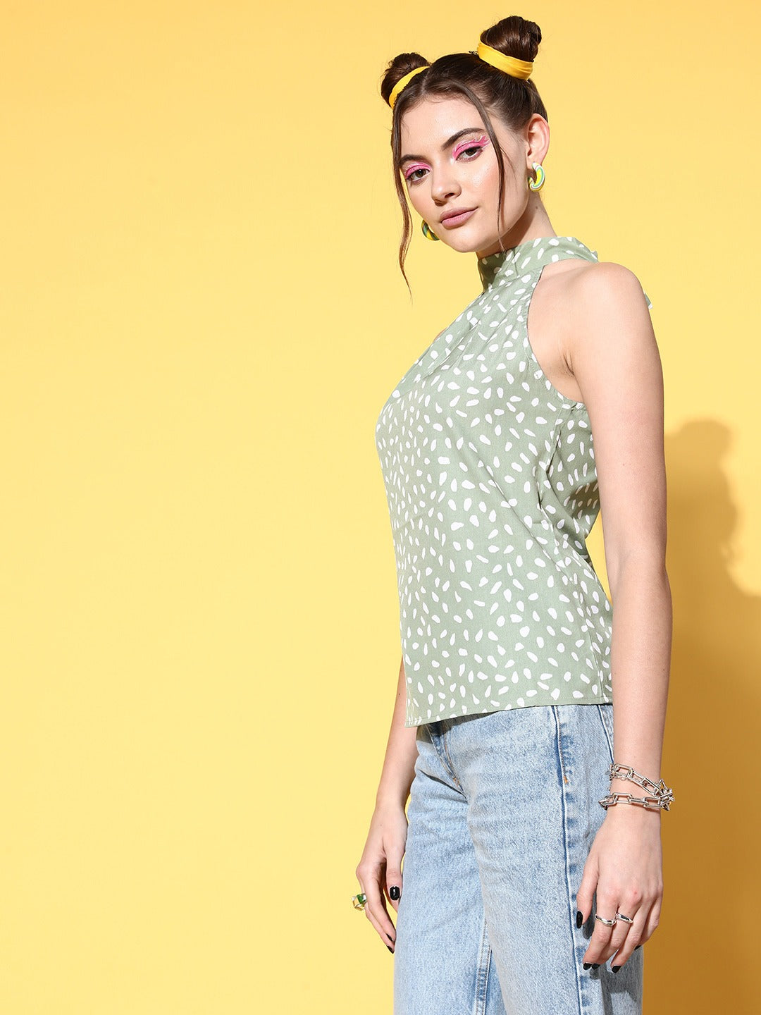 Berrylush Women Green & White Geometric Printed High Neck Sleeveless Tie-Up Back Regular Top
