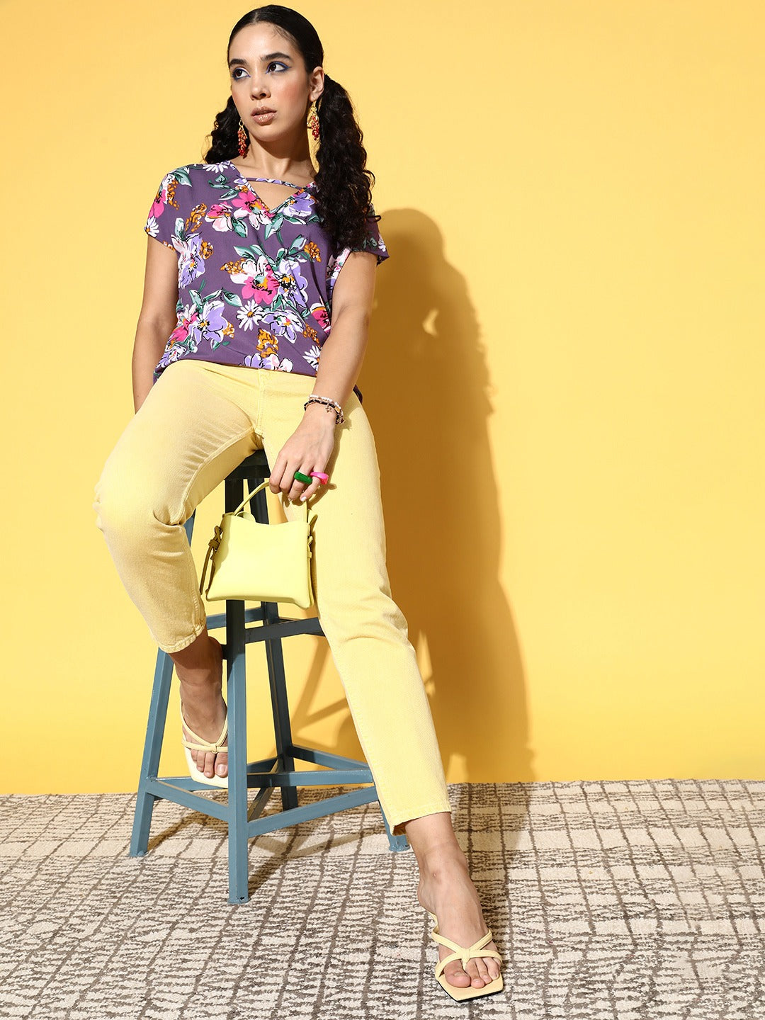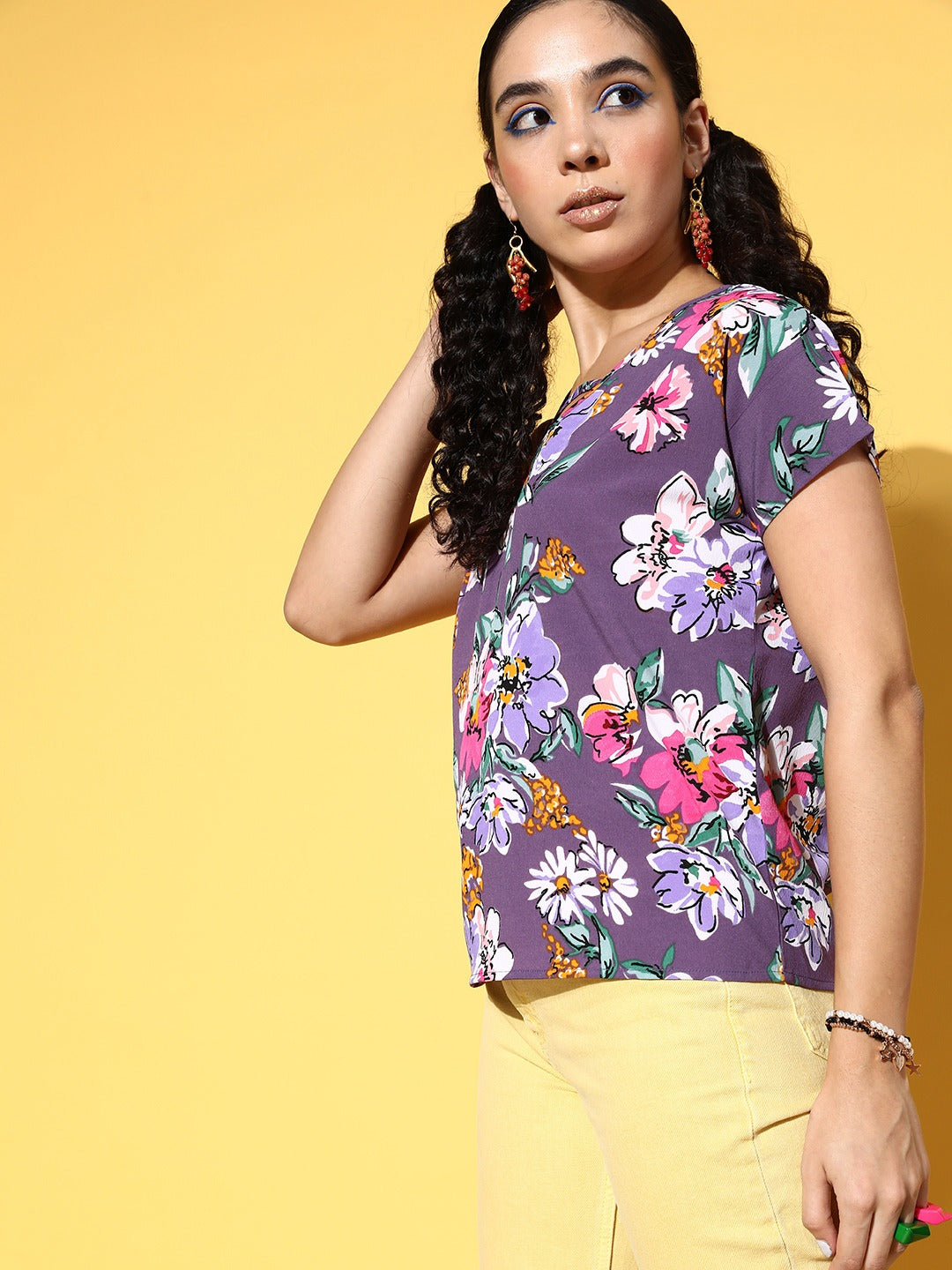 Make a timeless addition to your summer line-up by embodying trendy charm with this pretty Purple & White Floral Printed V-Neck Woven Crepe Regular Top introduced by Berrylush. Fashion in a regular profile to lend this top a modest and refined look with a practical finish. Showing off a beautiful amalgamation of purple and white floral print that gives this top a vibrant appeal while giving away an imperial vibe. The woven detailing upgrades the overall durability and visual appearance of this top. Partner up this top with trousers, a matching pair of flats, butterfly hoop earrings, and a purple side bag for a complete look.