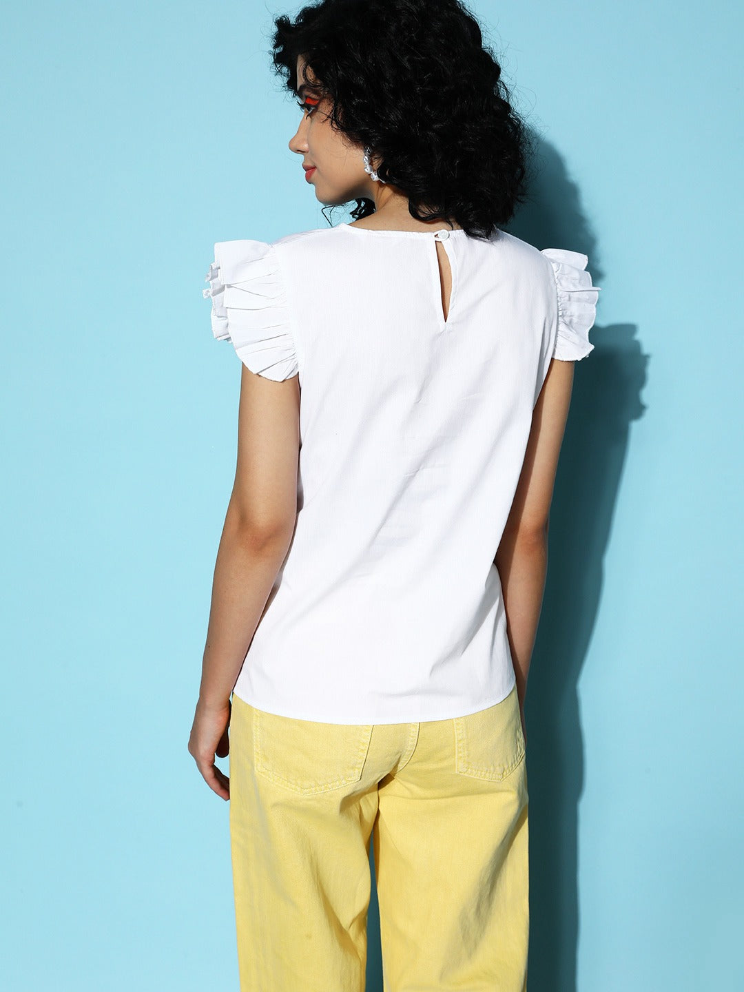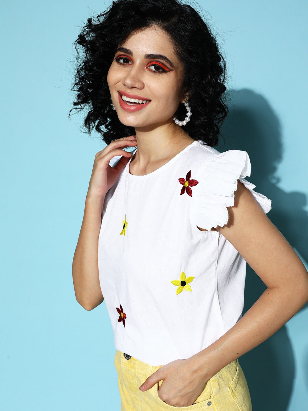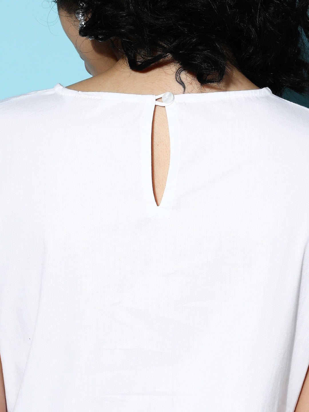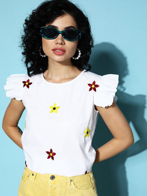 Re-edit your spring closet with radiant hues and flattering style elements by opting for this charming White and Maroon Floral Embroidered Round Neck Regular Top from Berrrylush. Showcasing refreshing maroon floral patterns throughout white shade that give this top a vibrant appeal followed by a pleasing vibe. The regular length lends this a modest style note with realistic touch and proper coverage of your upper body. Comes with woven detailing that offers your skin a super soft and irritation-free touch with flexible body movements. Meet your friends on weekend looking beautiful by wearing this top with your favourite jeans, block heels, pearl hoop earrings, and a cute side bag.