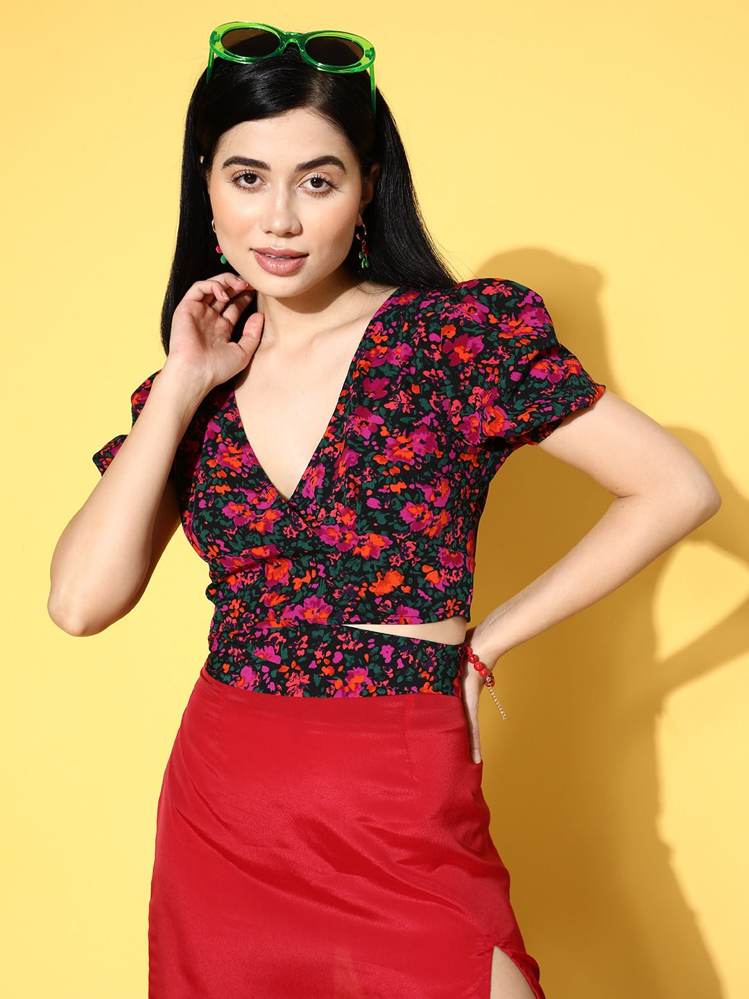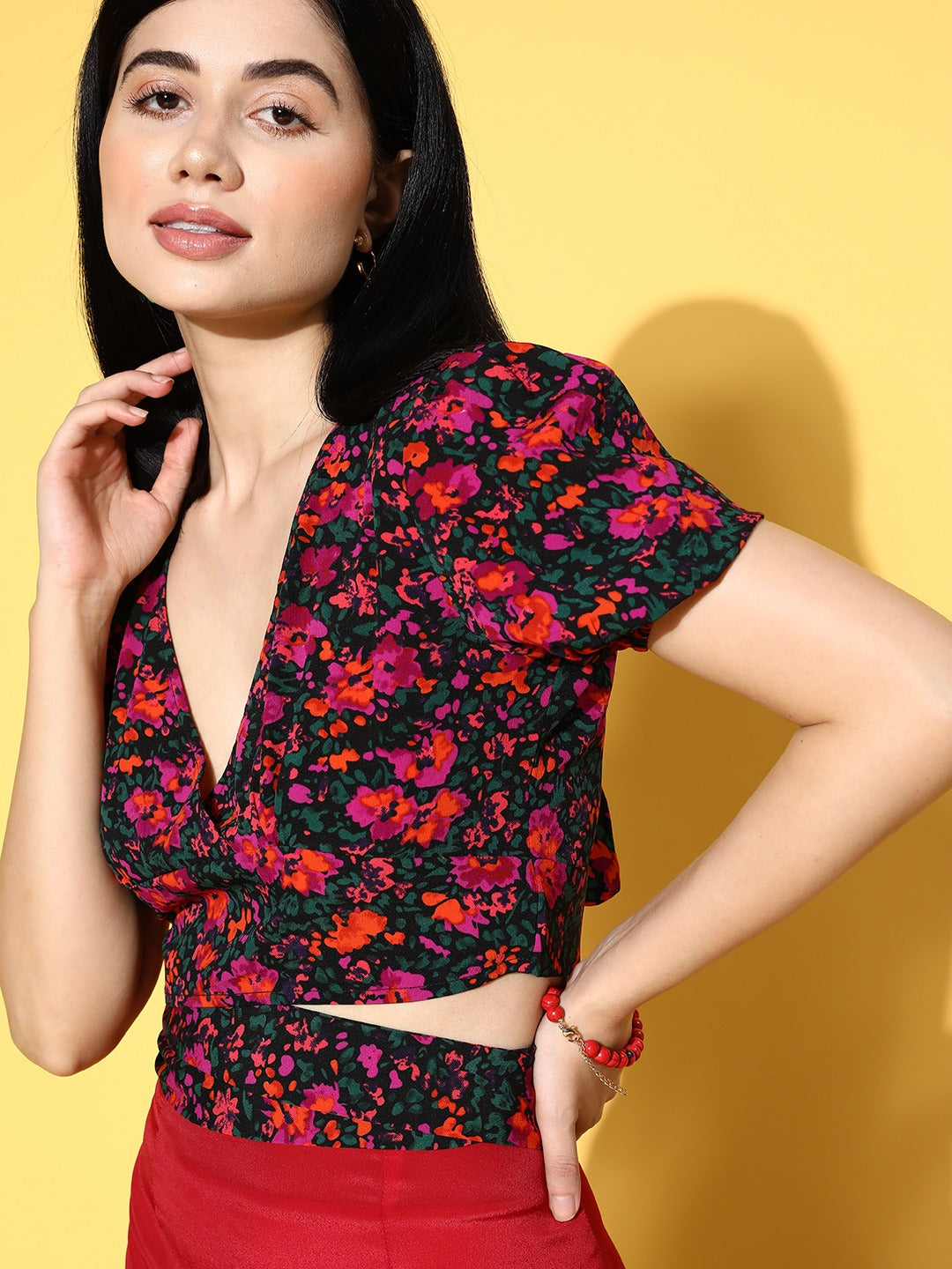 One can never get bored of florals thus inject a cheerful vibe to your capsule assortment with this pretty Purple and Green Floral Print Crepe Wrap Crop Top from Berrylush. Tailored in wrap style to lend this top a fitted shape that highlights your feminine figure along with a garnishing touch. Showing off a tie-ups closure that offers this top an option for additional fitting along with an easy-to-style attribute. Moreover, the woven detailing supports flexible body movements with the anti-abrasion feature. Complete your casual look glamorously by wearing this crop top with a red mini skirt, a pair of high-heels, matching earrings, and a cute side bag.