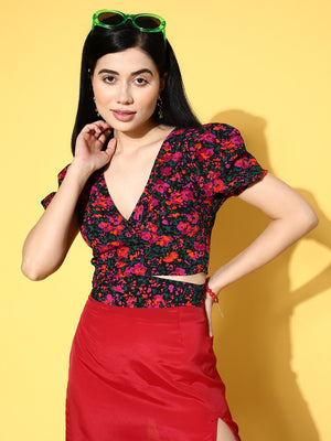 Berrylush Women Purple & Green Floral Printed V-Neck Tie-Up Back Crepe Wrap Cropped Top