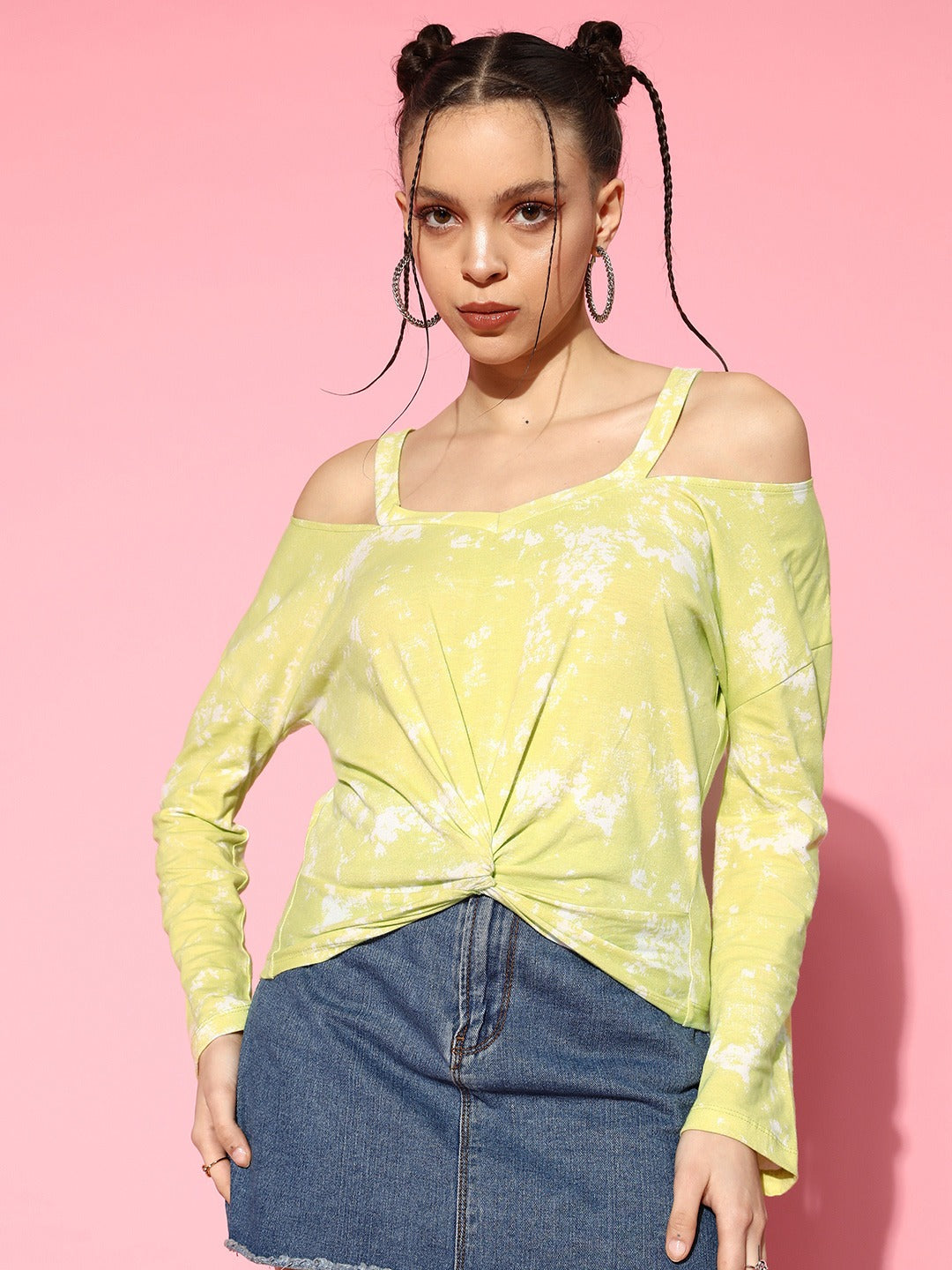 Berrylush Women Yellow & White Tie-Dye Printed Square Neck Cold-Shoulder Sleeves Twisted Regular Top