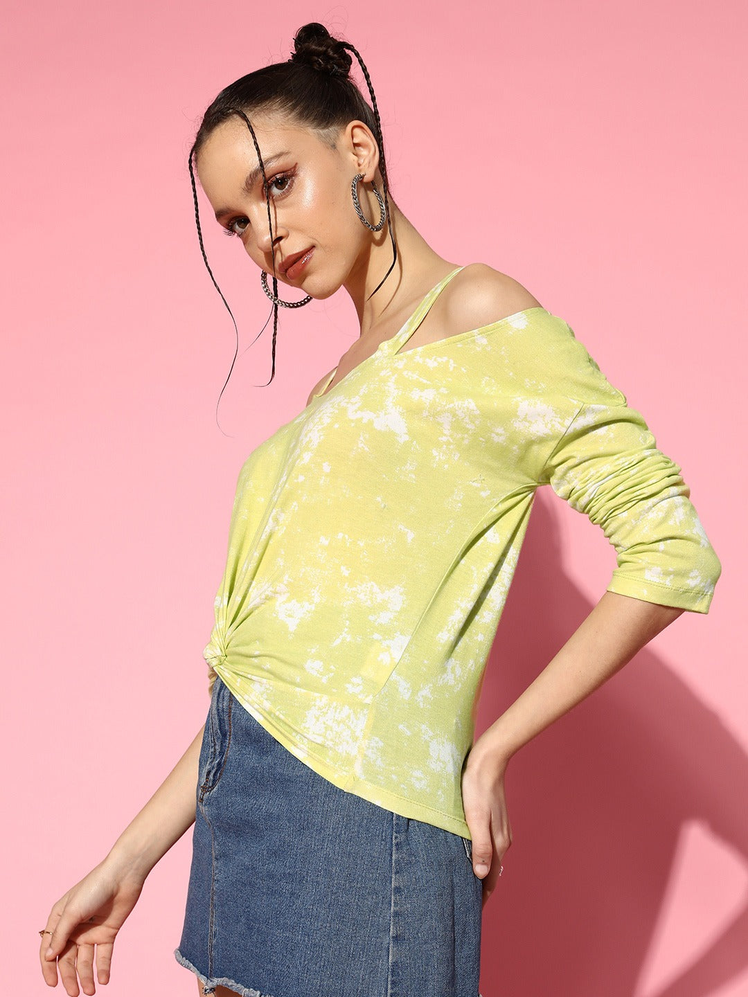 It's time to refresh your casual closet with the latest style factors by adding to your cart this bedazzling Yellow and White Tie-Dye Printed Square Neck Twist Regular Top from the upgraded print and pattern collection launched by Berrylush. Punctuated from high-quality cotton fabric that lends this top astonishing resistance from creasing and fading over time with low maintenance. Featuring a regular length that makes this top appear modest with appropriate coverage to your upper body. The knitted weave adjoins the elastic nature of this top along with seamless stitching. You can wear this regular top with your favourite jeans, white sneakers, cute stud earrings, and a white waist bag to get a stylish athleisure look for your next outing.