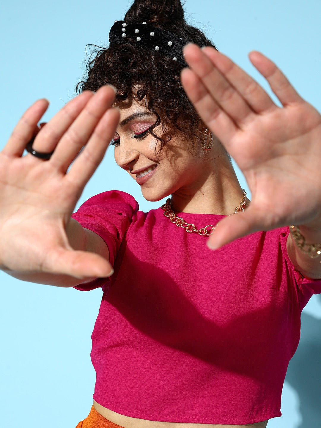 Berrylush Women Solid Pink Round Neck Puff Sleeves Crepe Styled Tie-Up Back Cropped Top