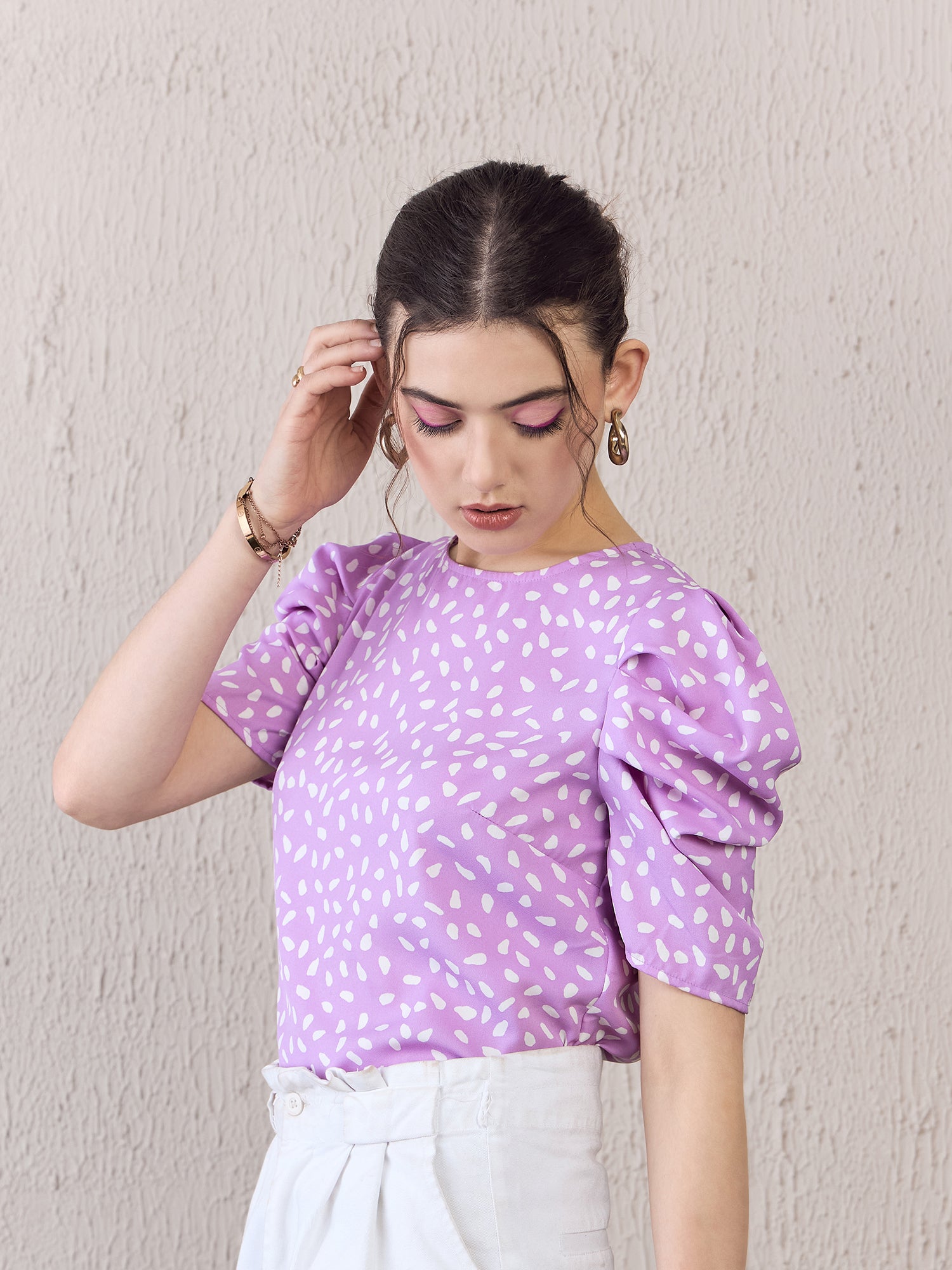 Infuse a dash of playful elegance into your casual wardrobe with Berrylush's Purple & White Abstract Printed Top. The round neckline and short puff sleeves add a touch of whimsy, while the keyhole back closure secured by a chic button offers an understated allure. Featuring crisp pleats that lend texture to its regular fit, this top is crafted from durable polyester in an eye-catching abstract print. Perfect for various day-to-day activities or laid-back weekend outings, its opaque fabric ensures coverage and comfort as you move stylishly through your day.