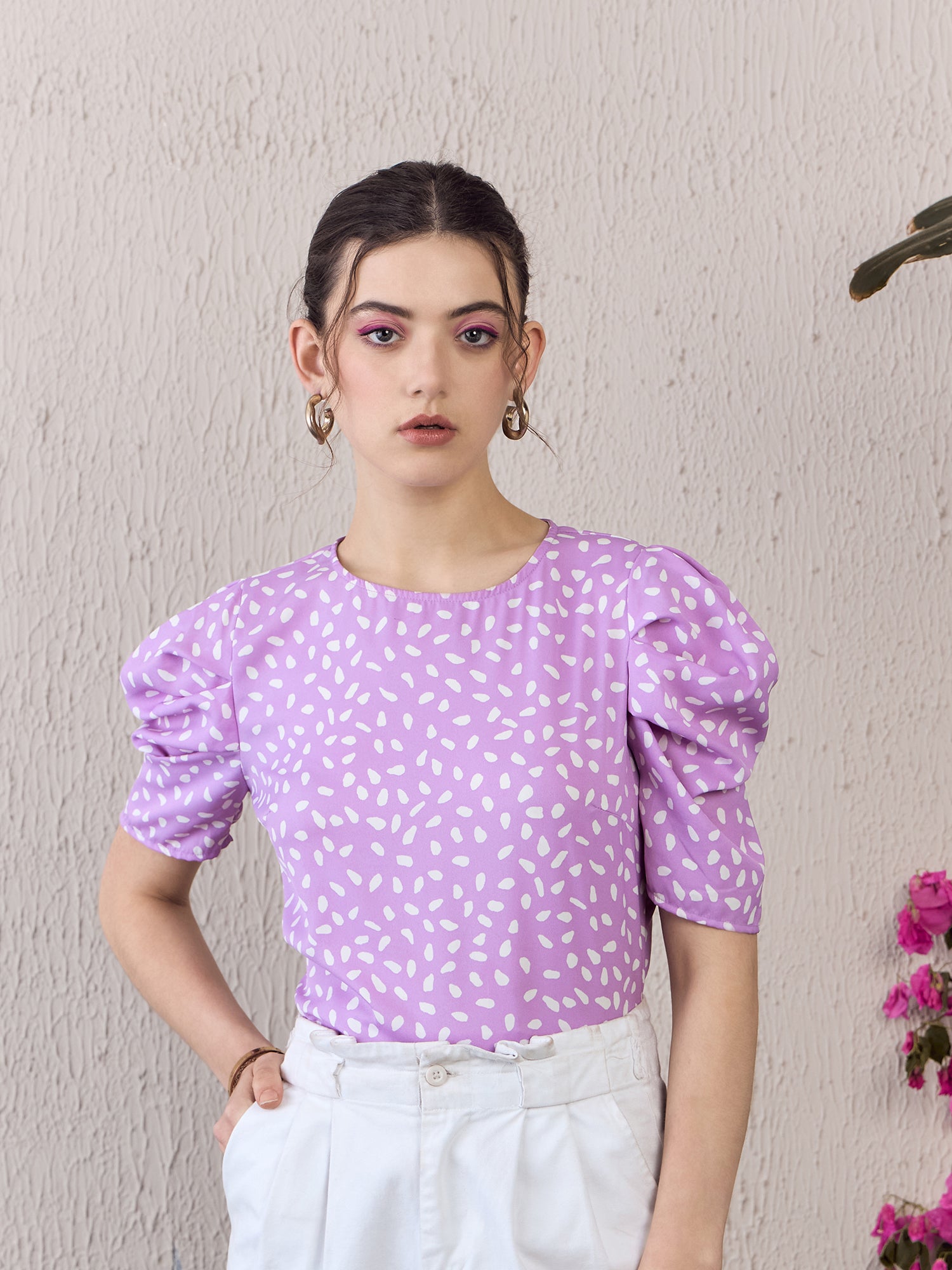 Berrylush Women Purple & White Abstract Printed Round Neck Puff Sleeves Keyhole Back Pleated Regular Top