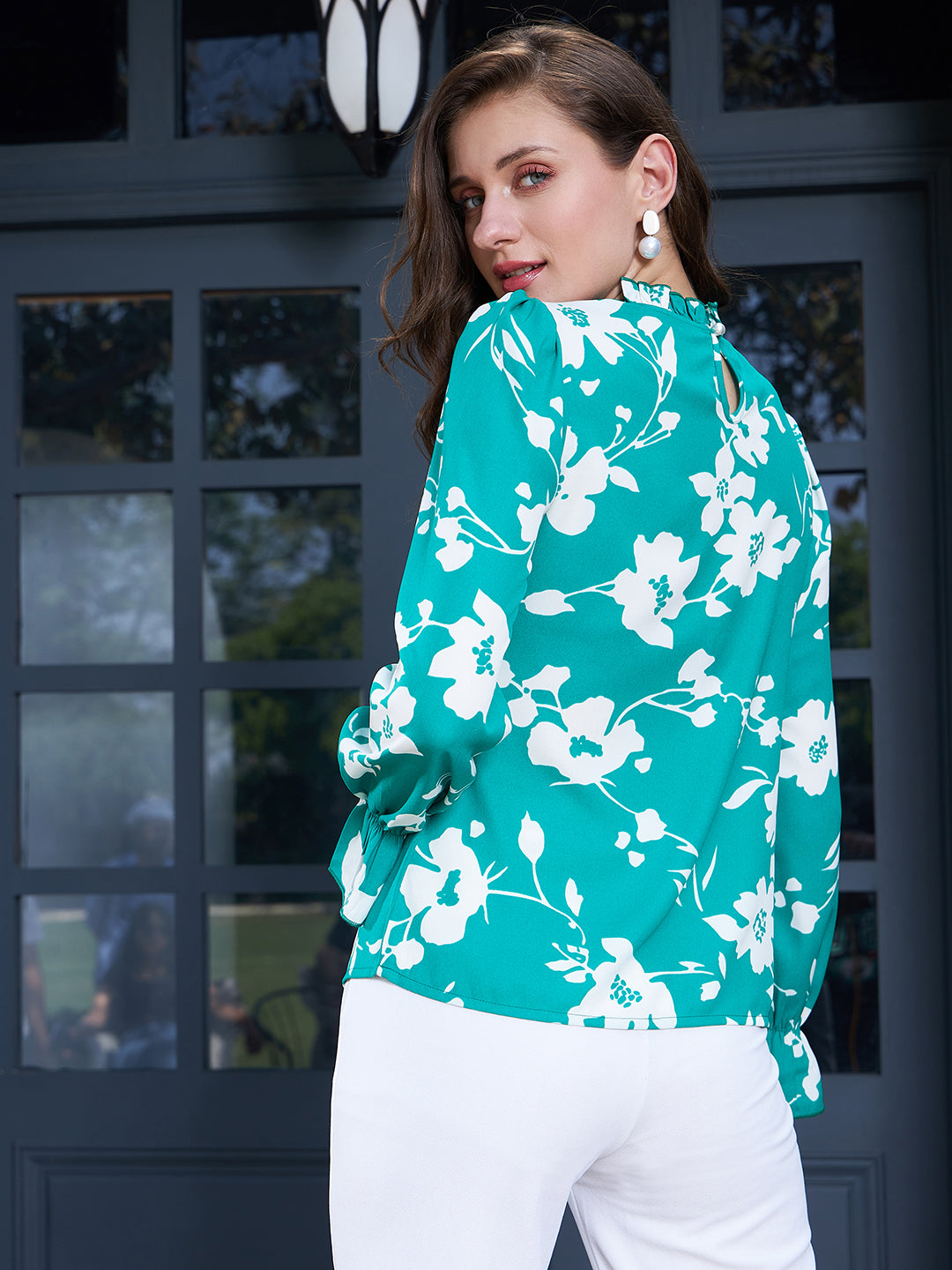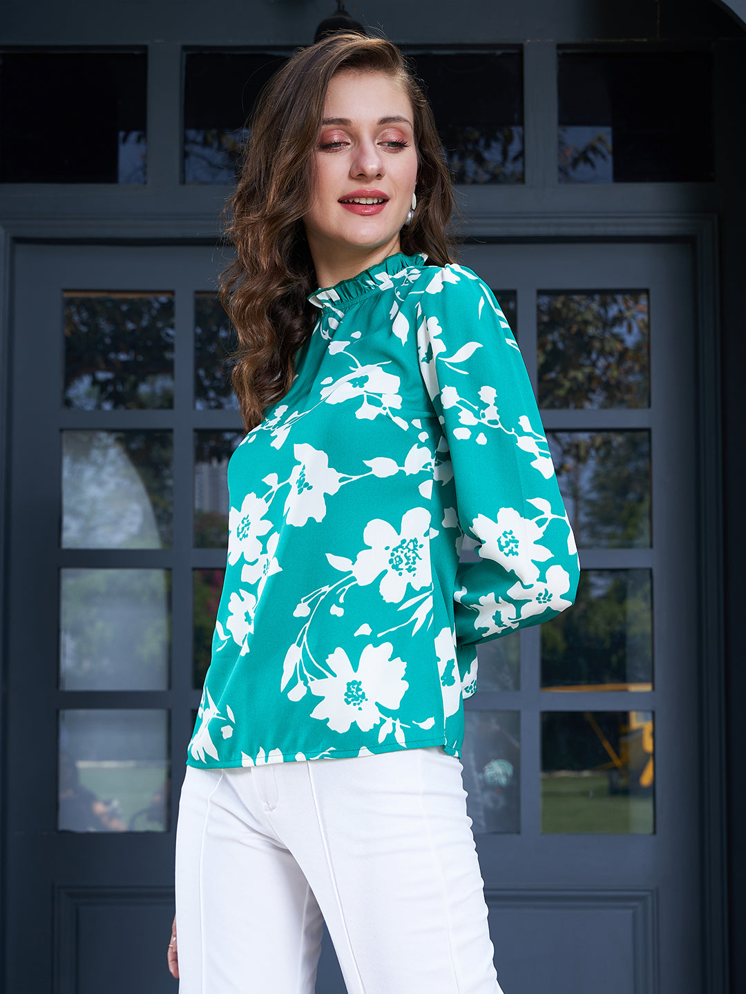 Berrylush Women Green & White Floral Printed High Neck Bell Sleeves Crepe Button-Up Regular Top
