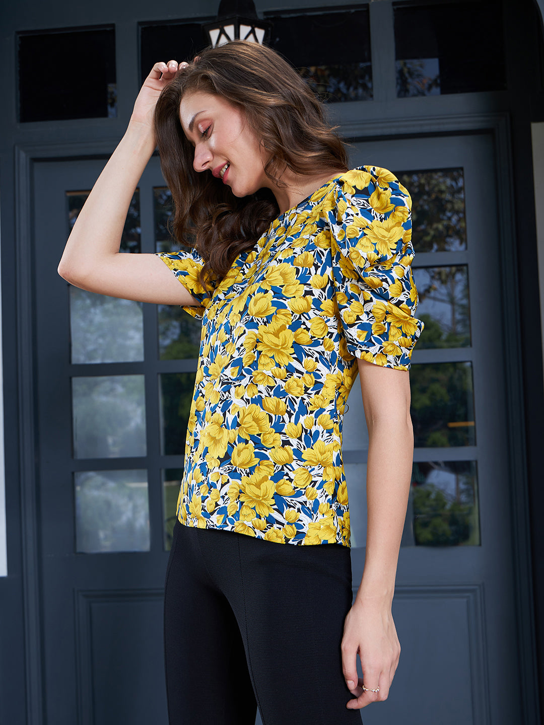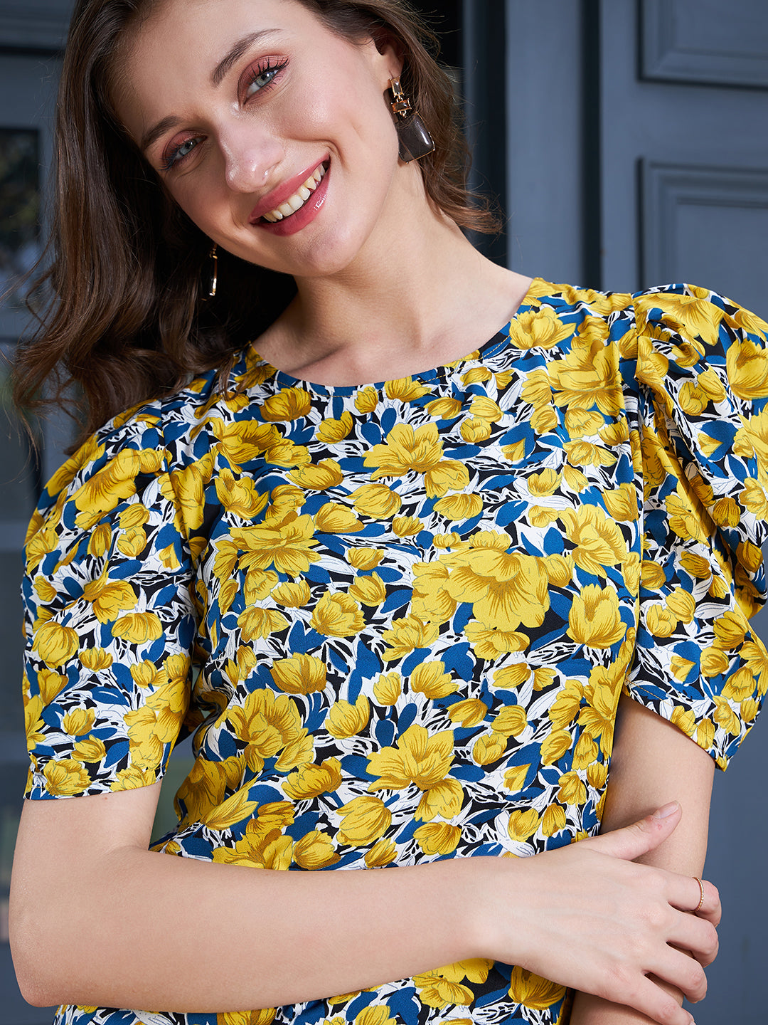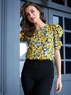 Berrylush Women Yellow & Blue Floral Printed Round Neck Puff Sleeves Crepe Button-Up Regular Top