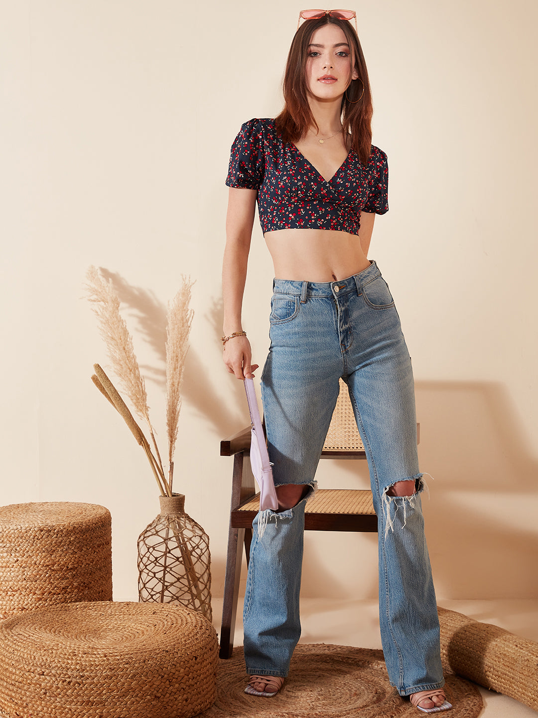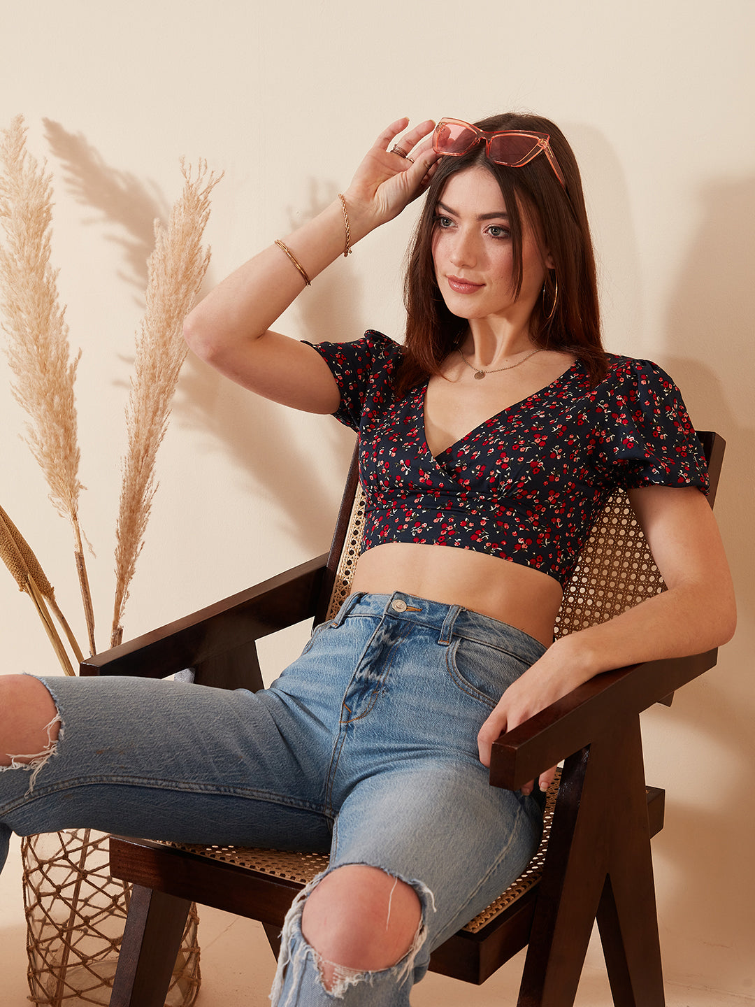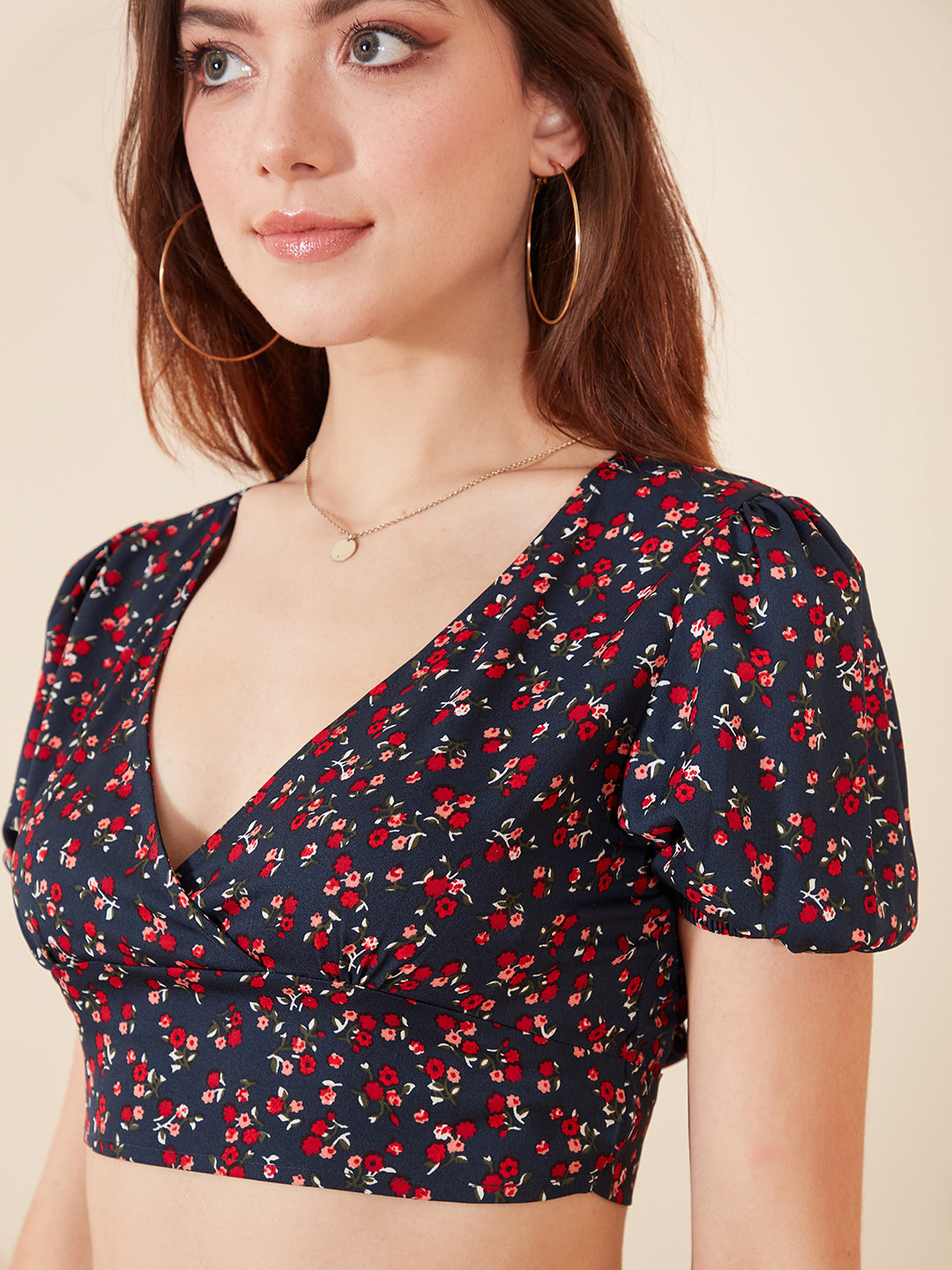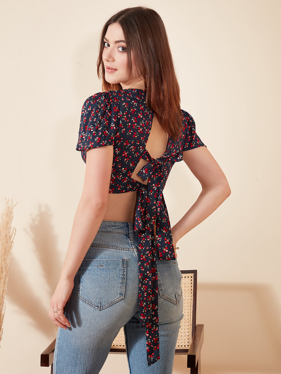 Berrylush Women Navy Blue & Red Ditsy Floral Printed V-Neck Puff Sleeve Tie-Up Cutout Backless Wrap Cropped Top