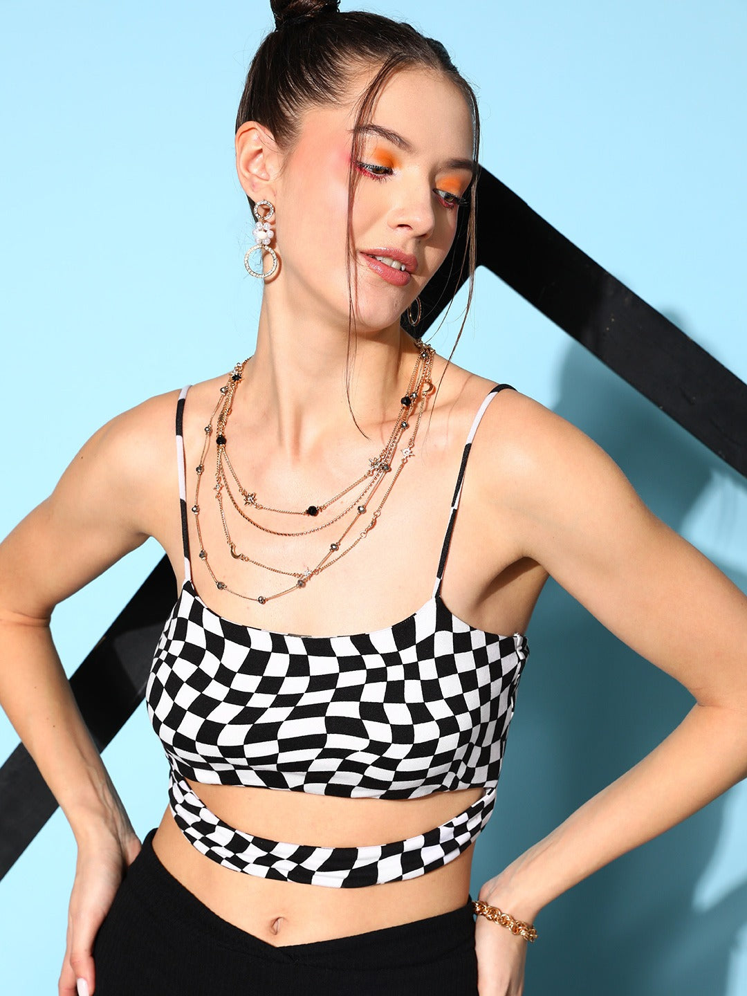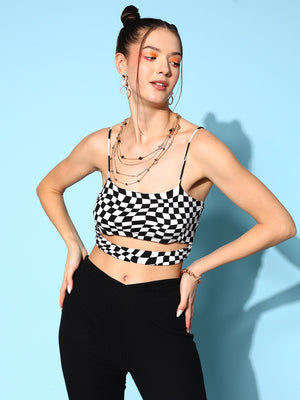 Berrylush Women White & Black Checked Pattern Square Neck Sleeveless Knitted Crop Top