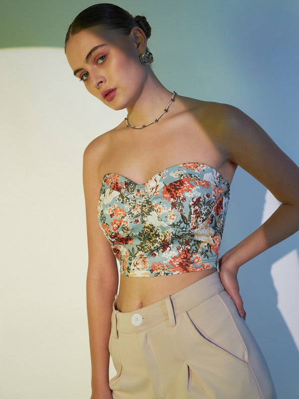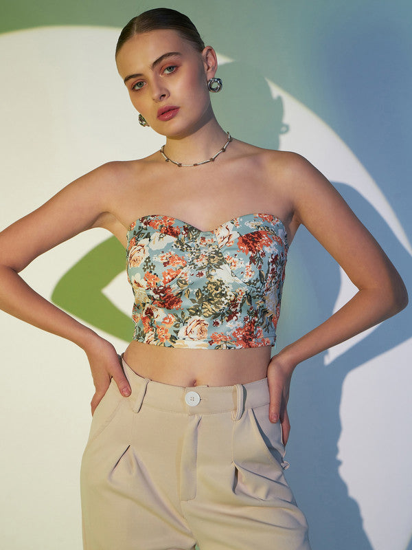 Berrylush Women Blue Floral Printed Strapless Neck Sleeveless Knitted Crop Tube Top