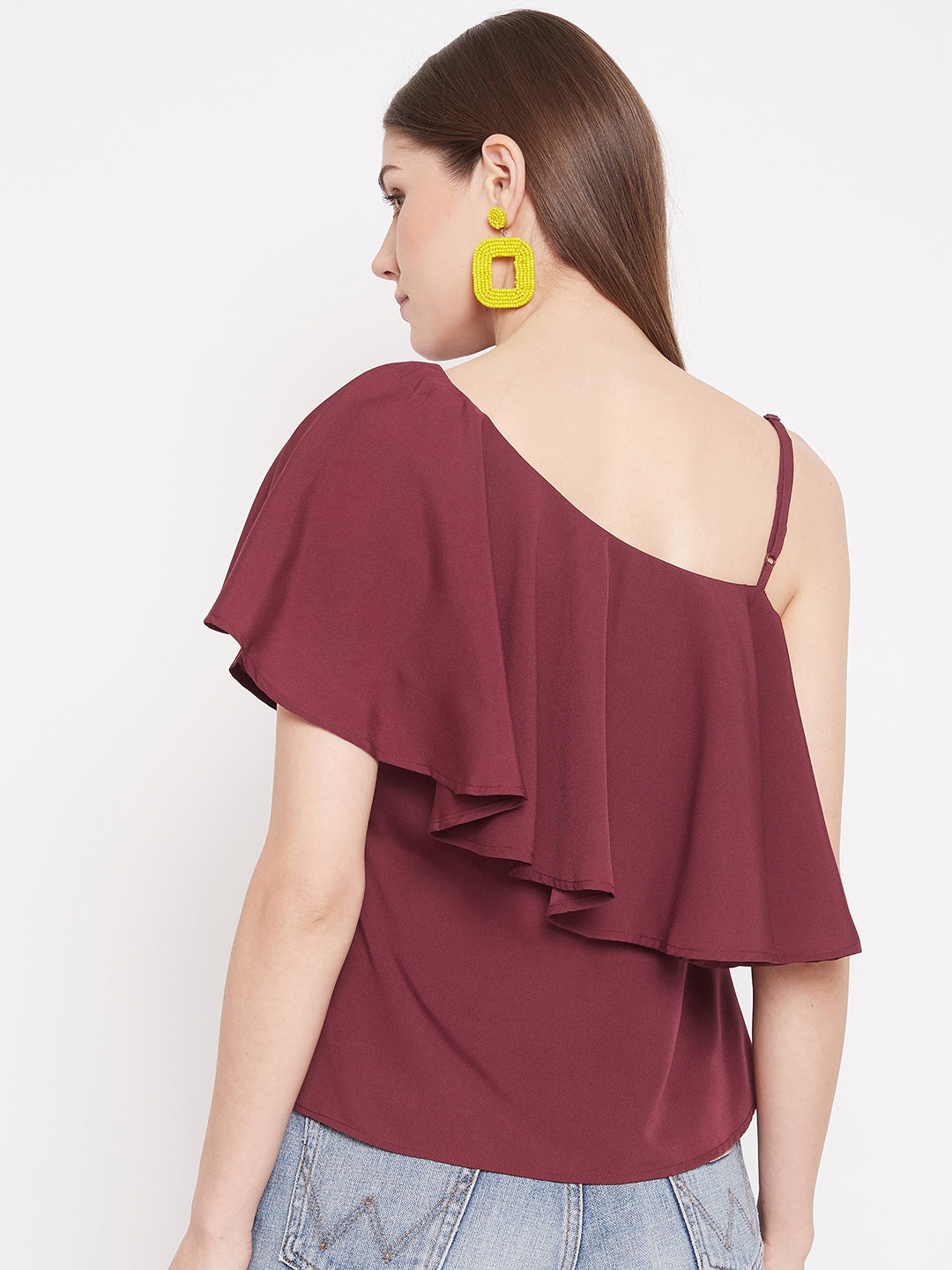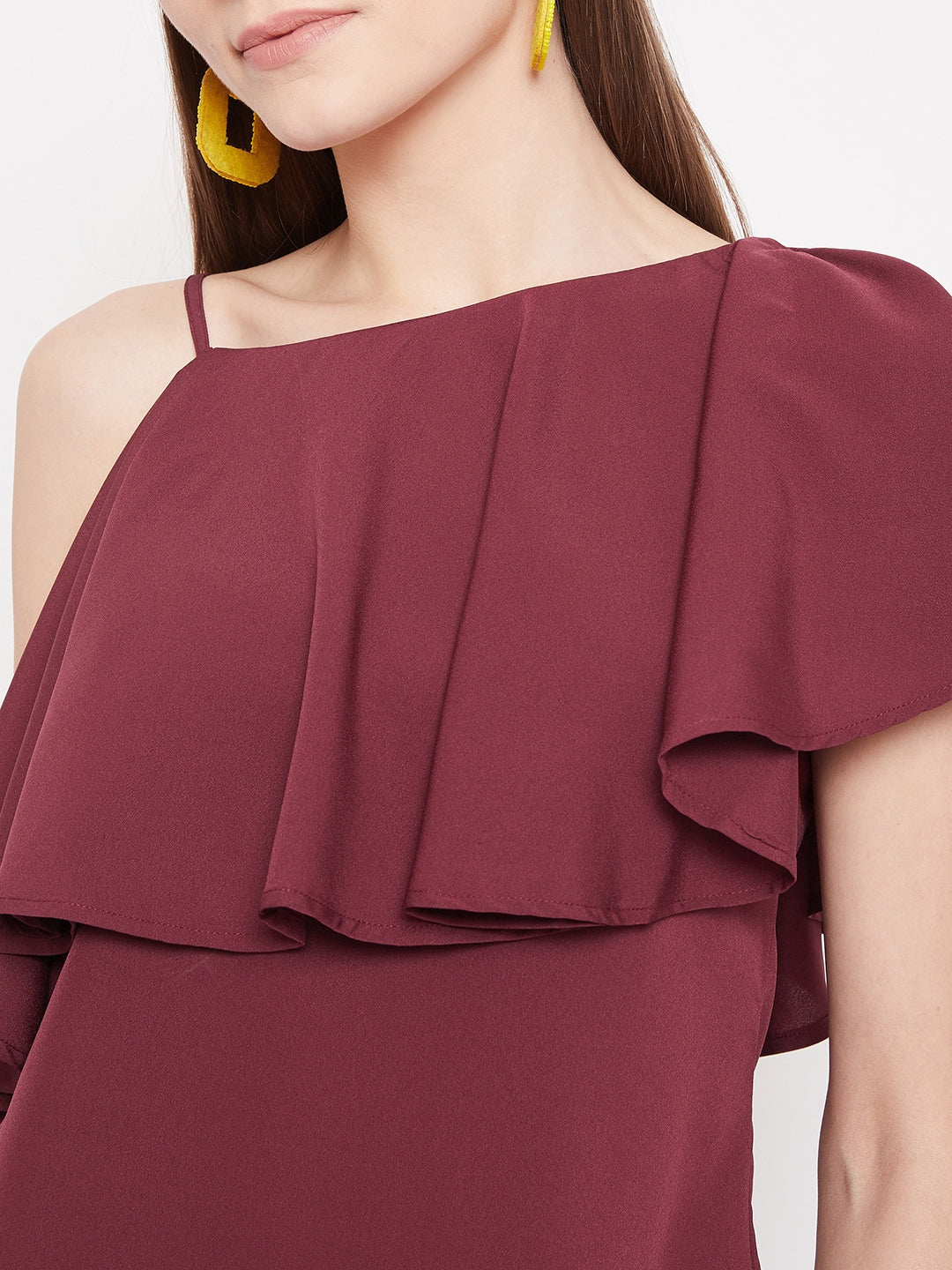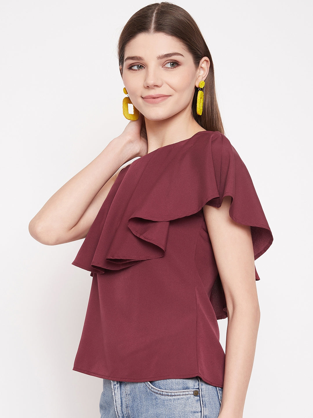 Berrylush Women Solid Maroon Ruffled One Shoulder Top