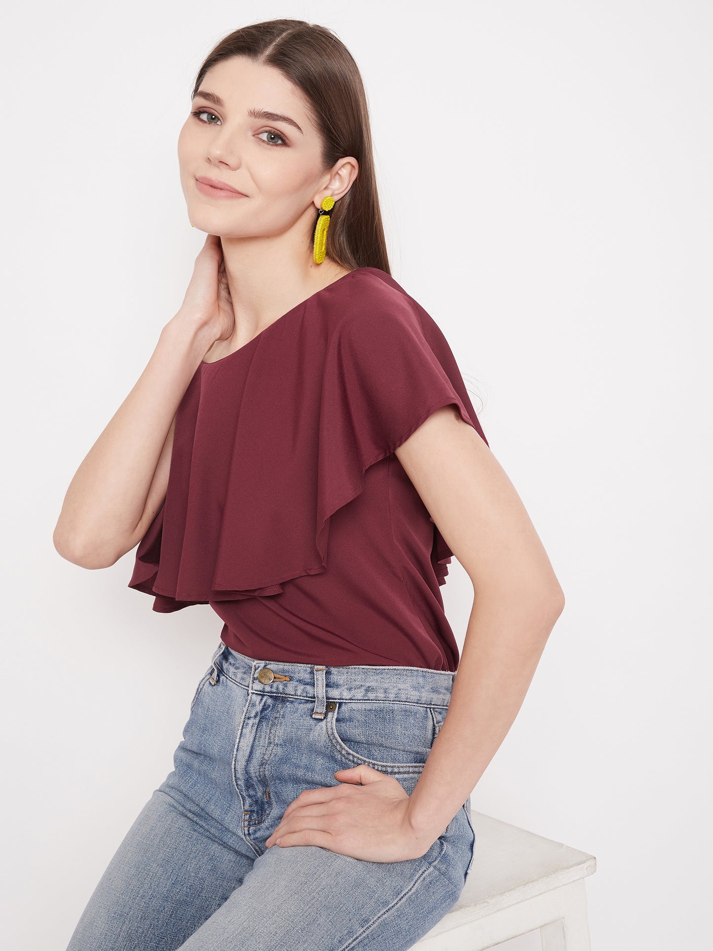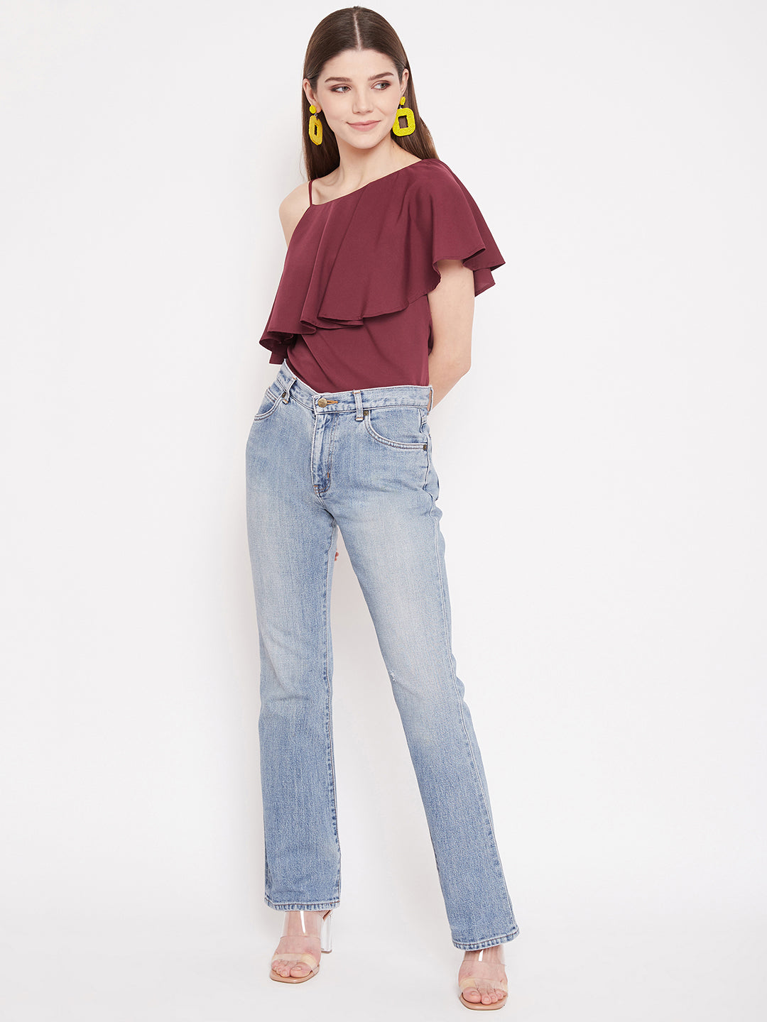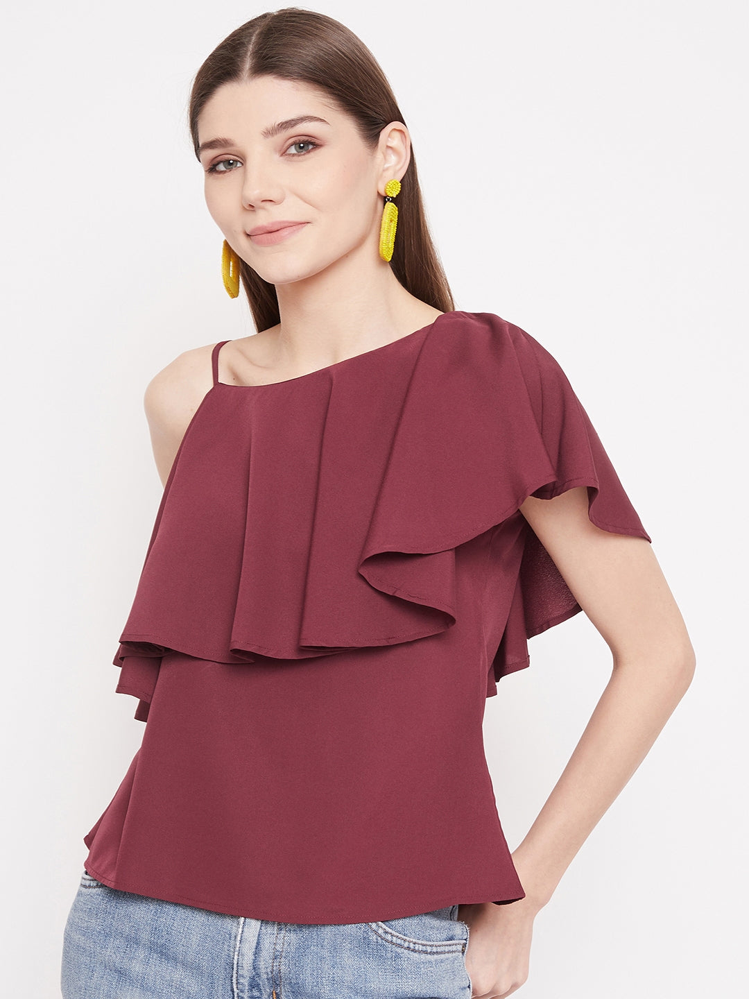 Berrylush Women Solid Maroon Ruffled One Shoulder Top