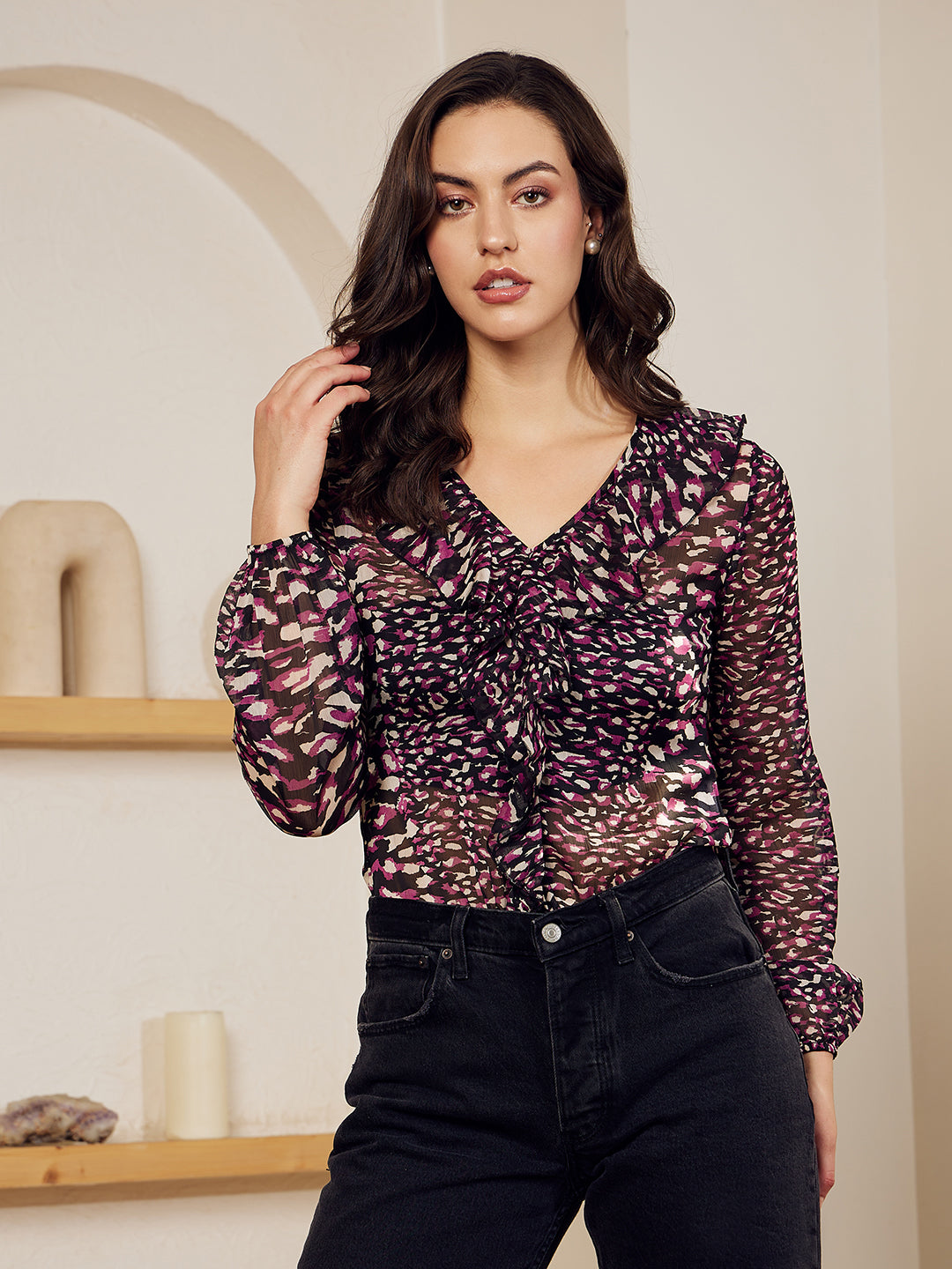If you know what's trending, then you'll surely not miss out on this boho-chic Black & Red Floral Printed V-Neck Bishop Sleeves Sheer Ruffled Shirt Style Top introduced by Berrylush. Punctuated from high-quality polyester material to provide amazing shape retain ability along with stain resistance attribute. Flaunting an astonishing black shade and floral print that makes this top appear eye-catching. Also, this top comes with sheer transparency to uplift the charm of this top with a comfy touch and texture to your skin. Mix and match this shirt-style top with your regular jeans, a pair of classy block heels, and a sassy handbag to get a sophisticated look.