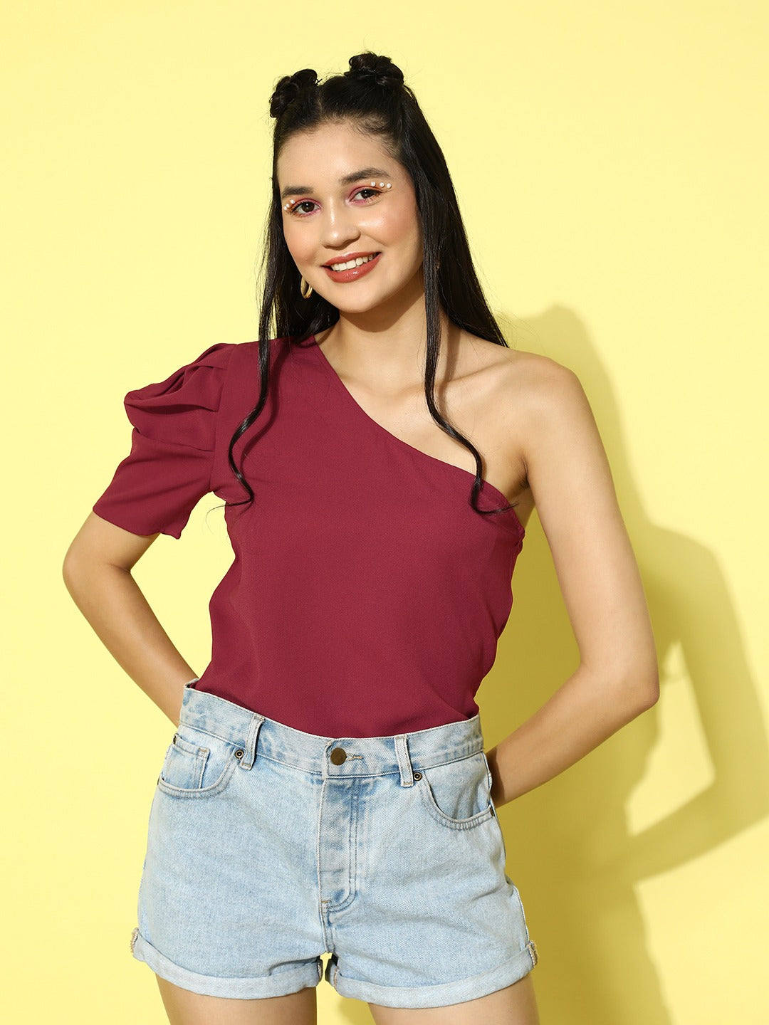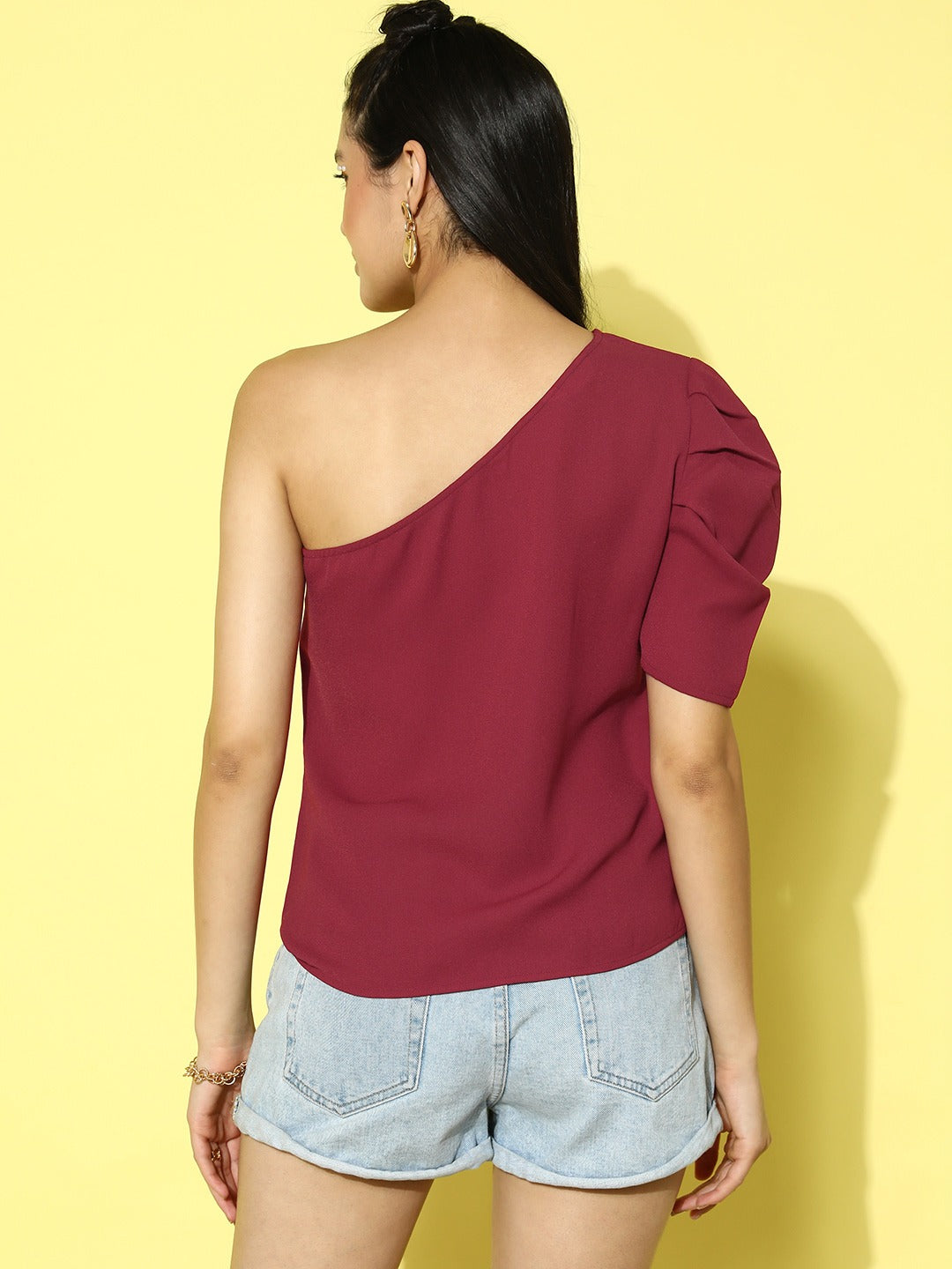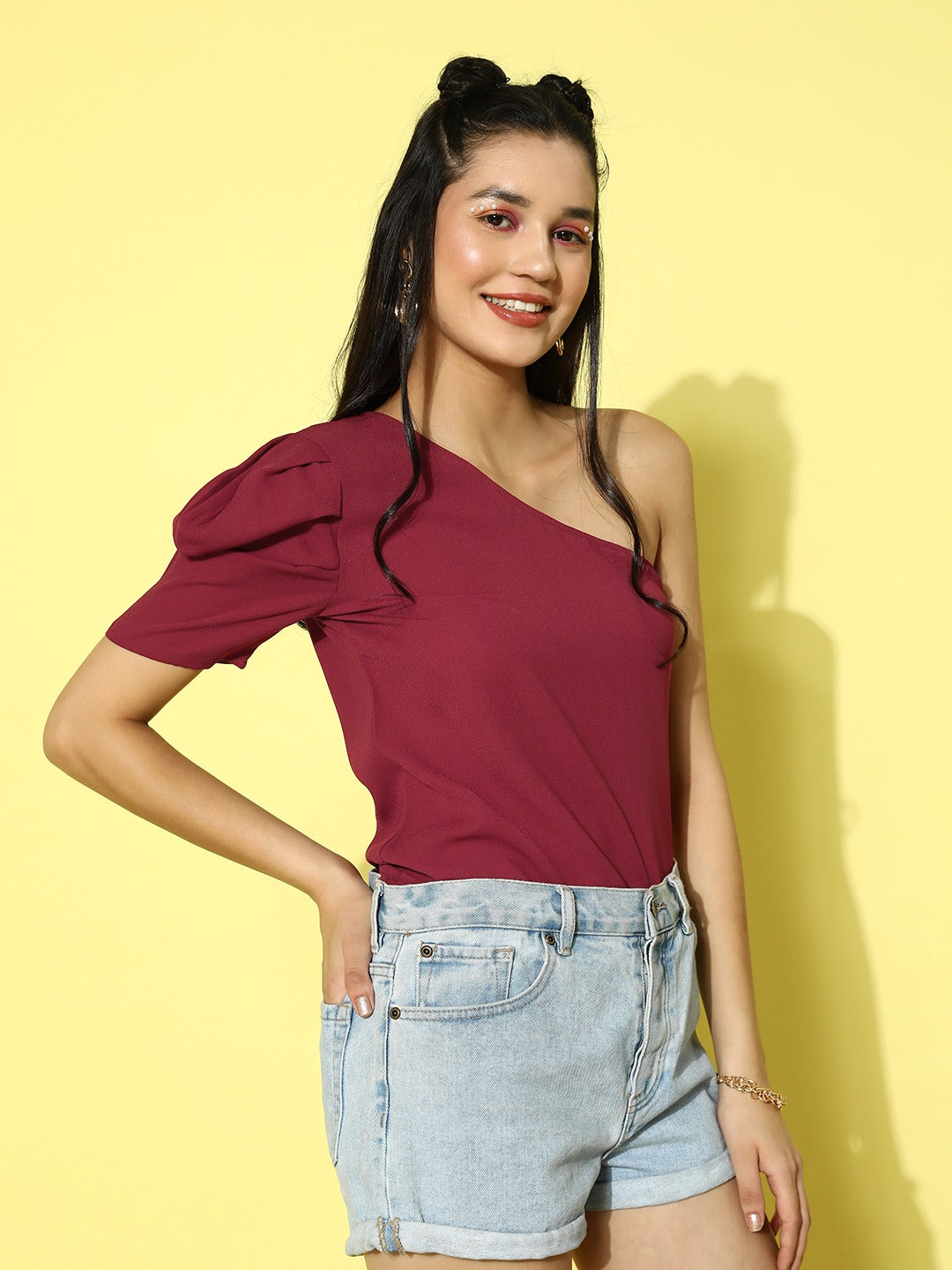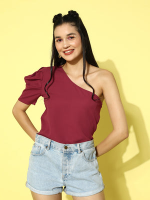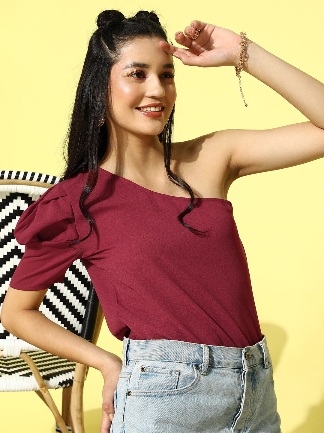 Berrylush Women Solid Red One-Shoulder Neck Puff Sleeves Slip-On Regular Top