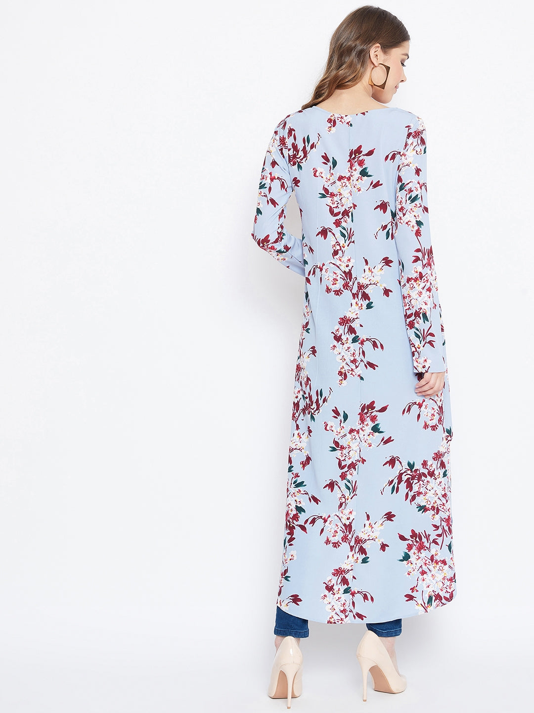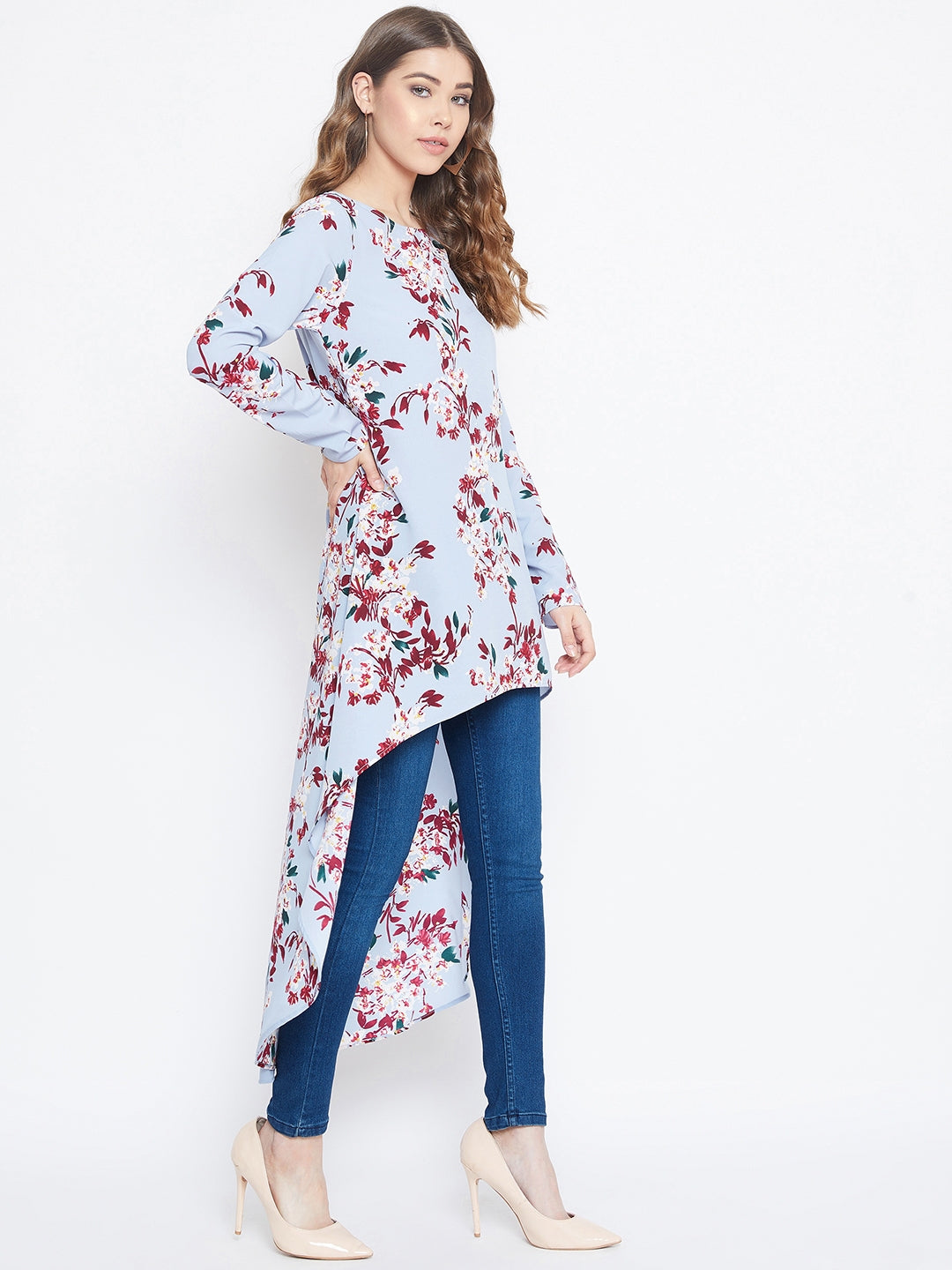 Berrylush Women Blue Floral Printed Round Neck High Low Top