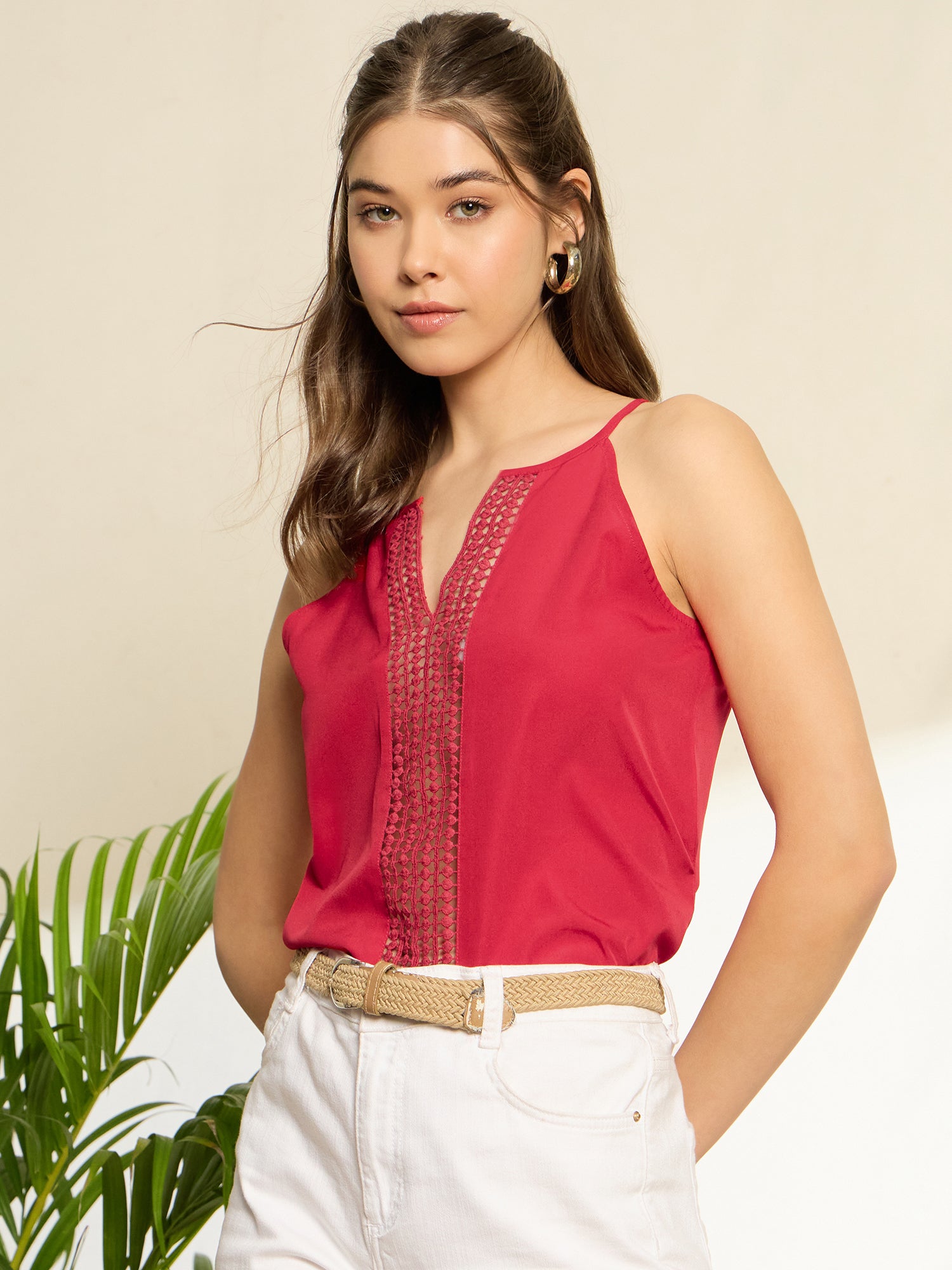 Berrylush Women Solid Red Notched Neck Sleeveless Front Cutout Straight Hem Regular Top