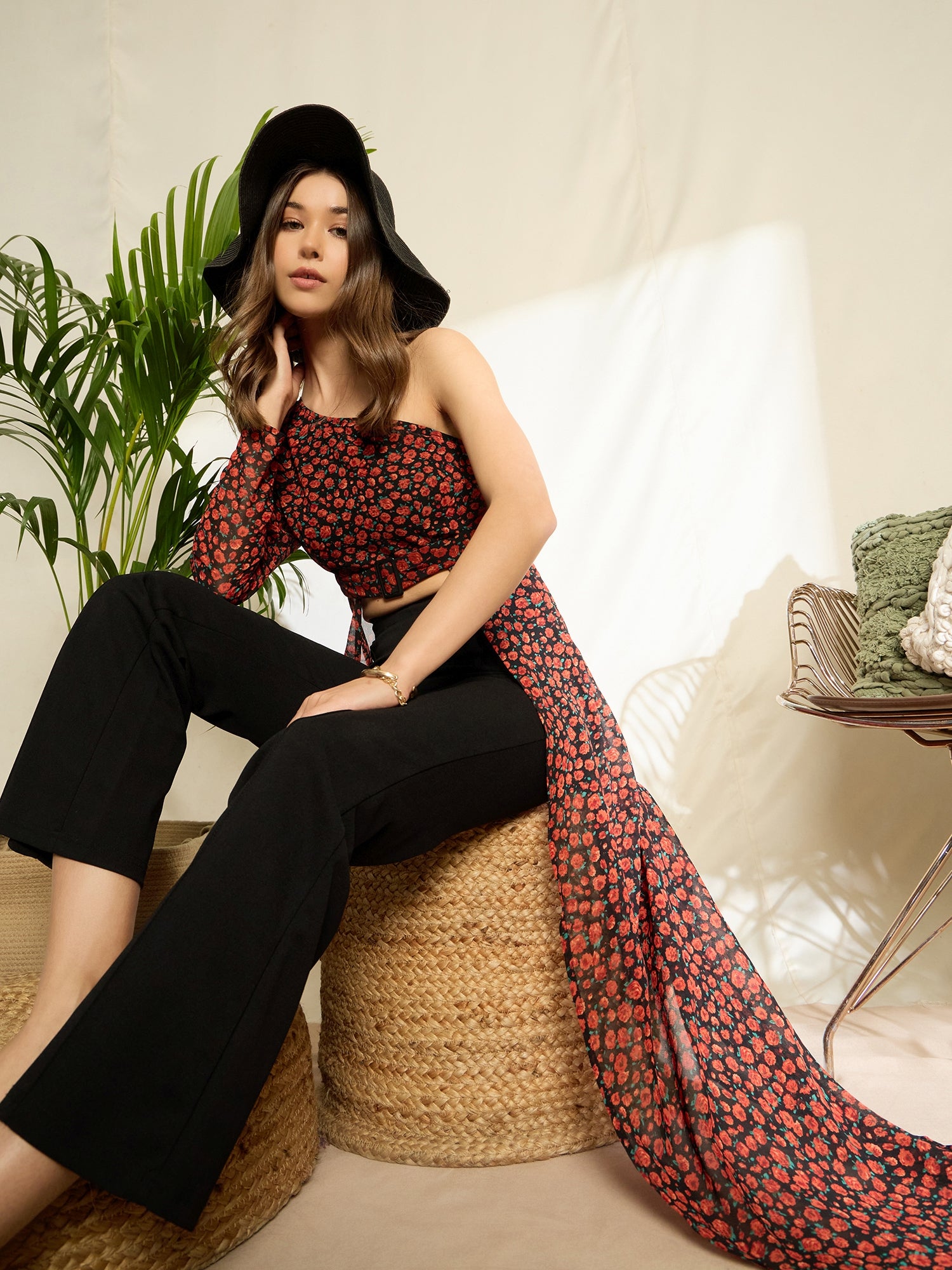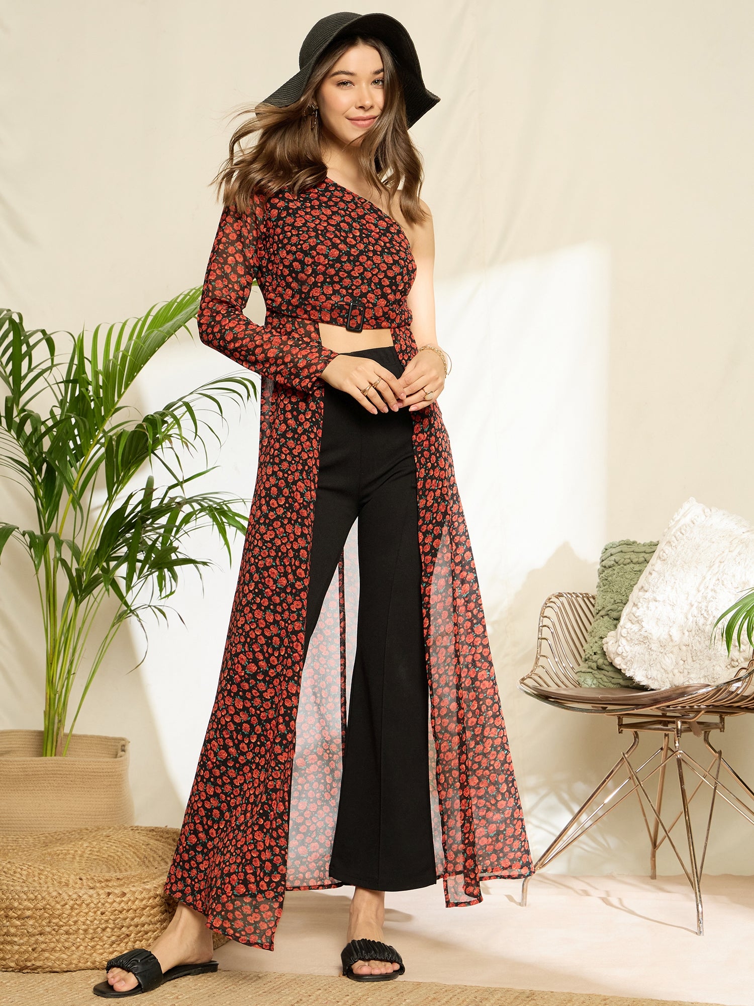 Berrylush Women Black & Red Floral Printed One-Shoulder Neck Belted Waist Split-Front High-Low Hem Longline Top