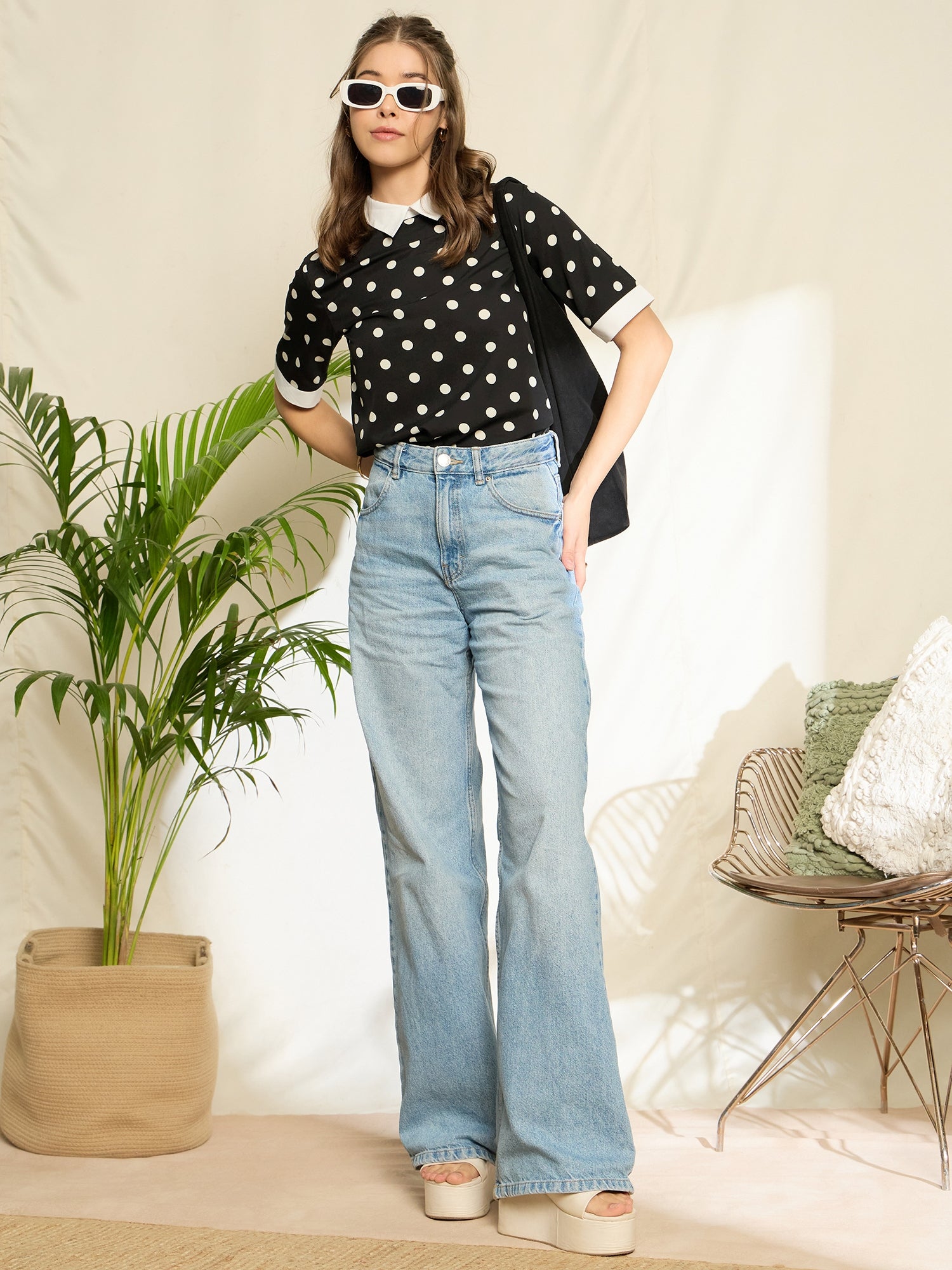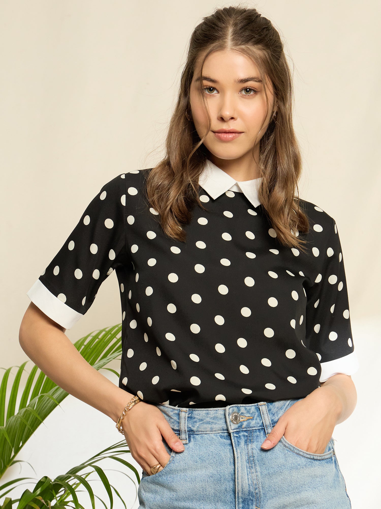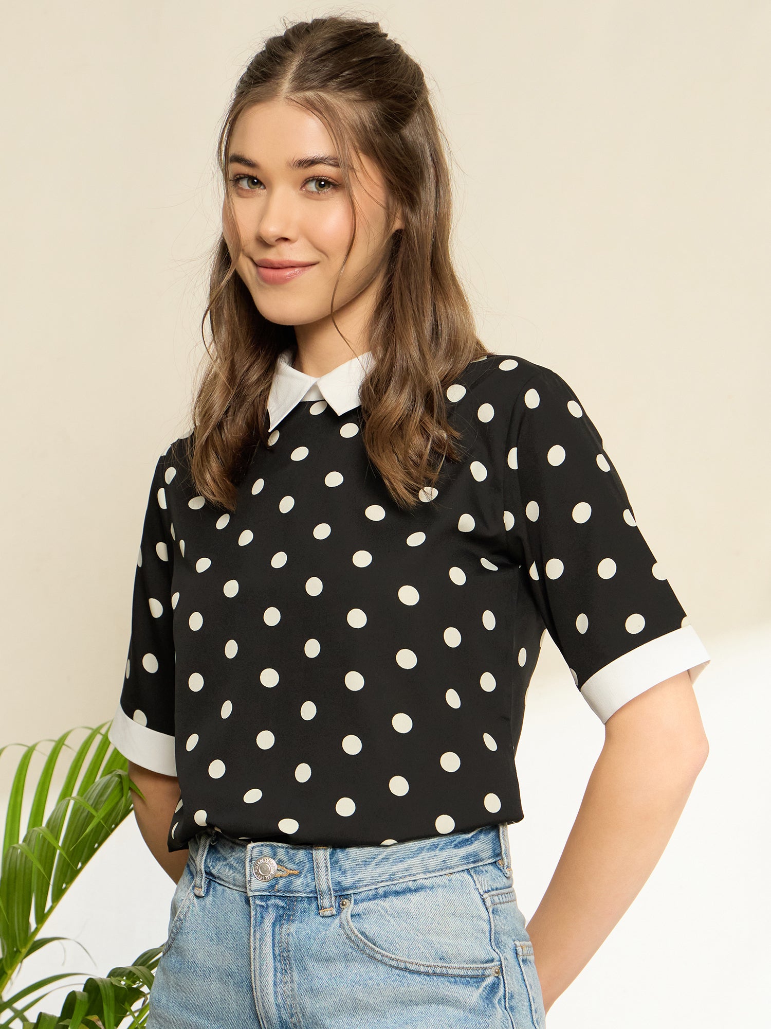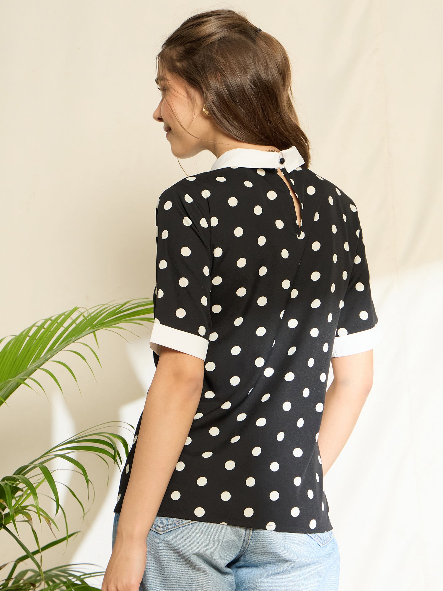 Berrylush Women Black Polka Dots Peter Pan Collar Short Sleeve Regular Top