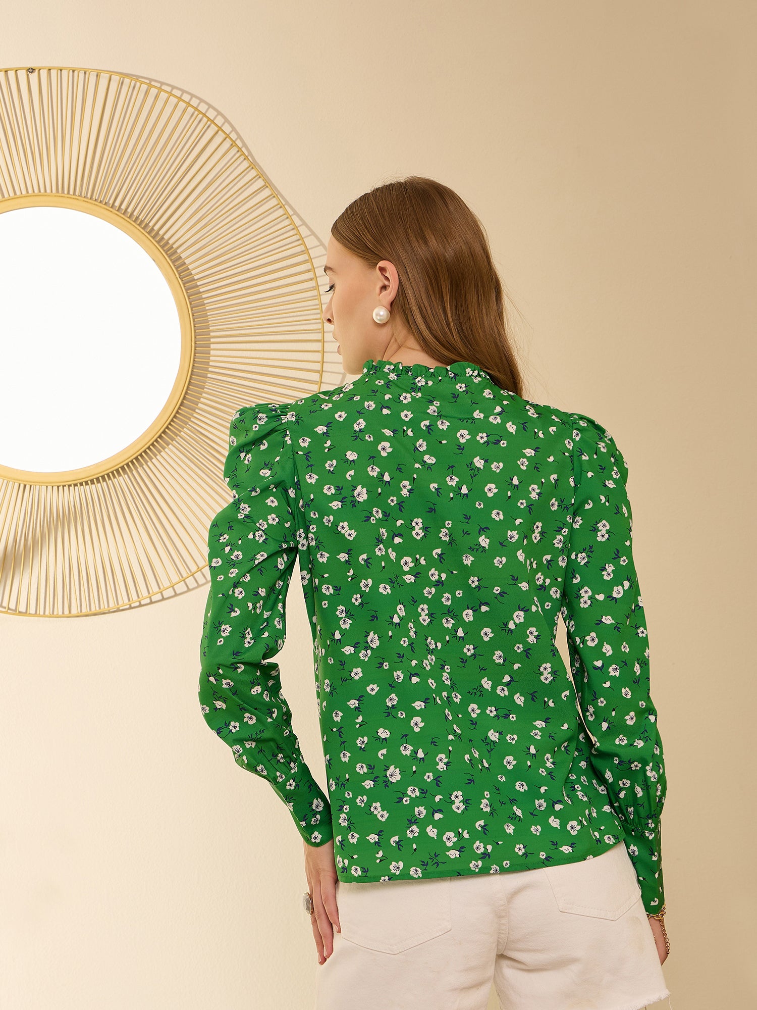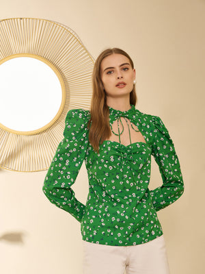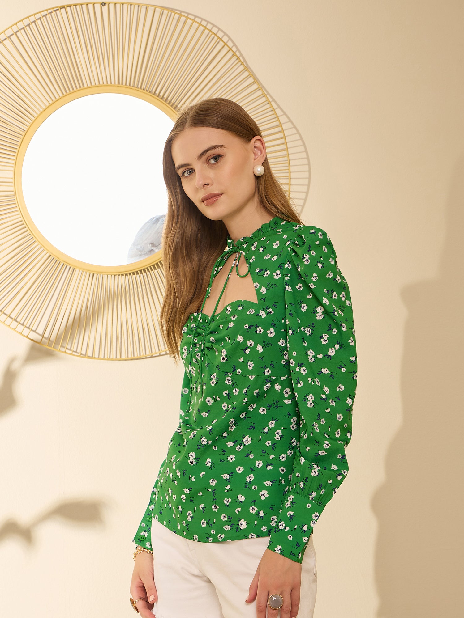 Berrylush Women Green & White Floral Printed High-Neck Puff Sleeves Front Cutout Tie-Up Ruched Regular Top