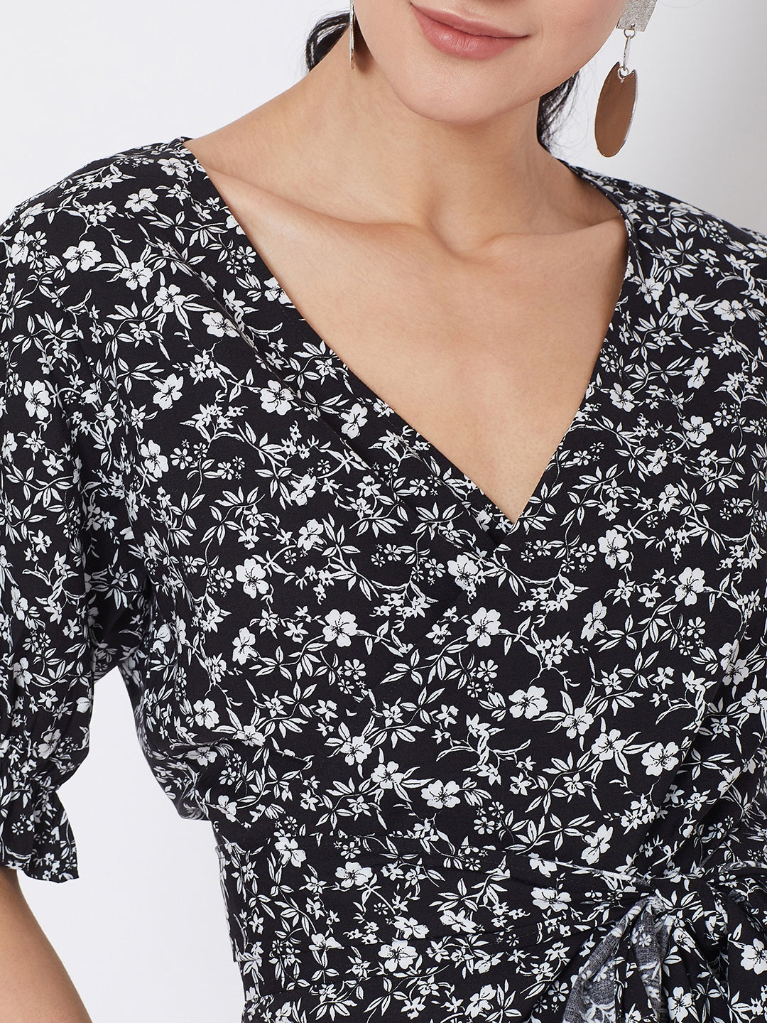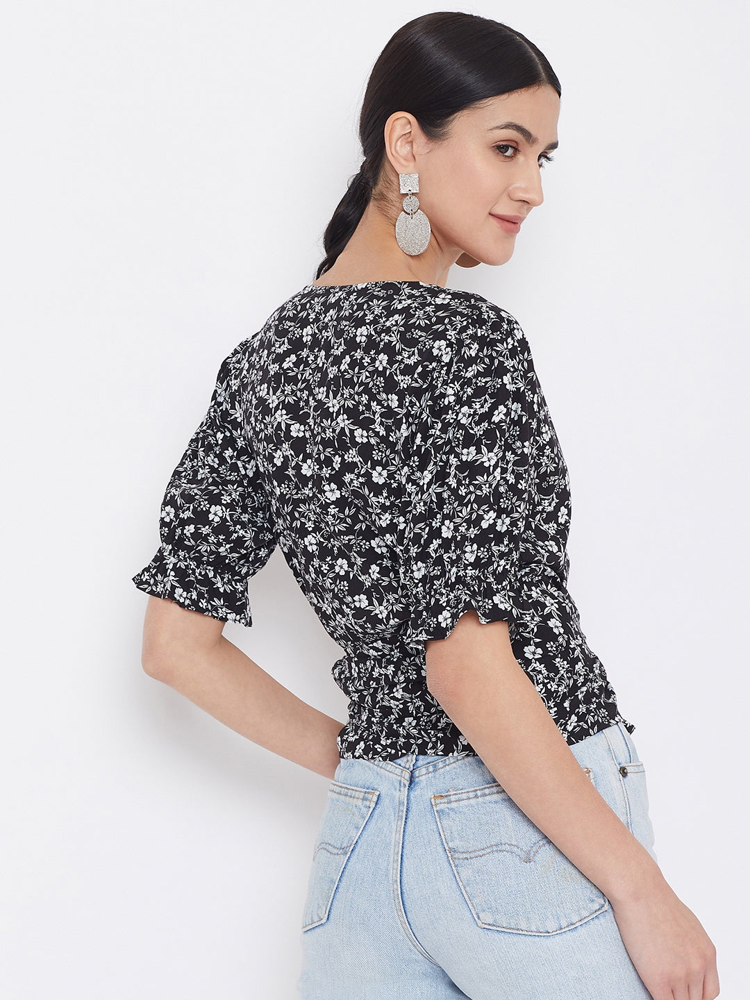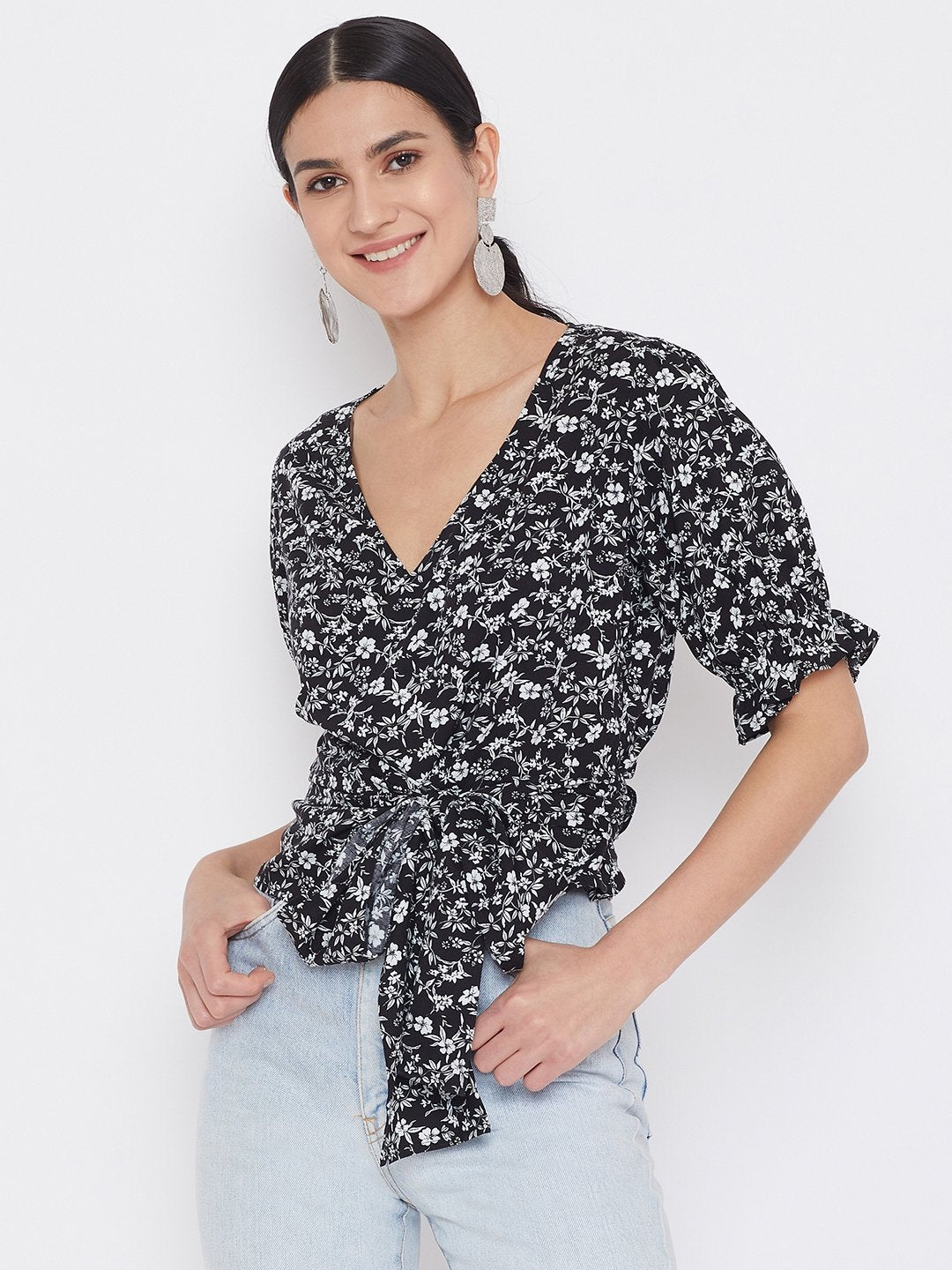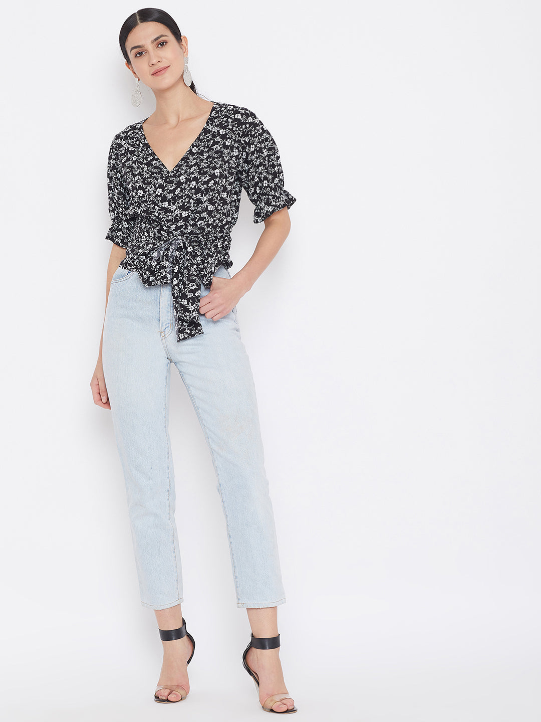 You will be ready to put a magnetizing effect on your casual evenings by putting this Black & White Floral Printed Tie Knot Top by Berrylush. With the fabulous feminine short puffed sleeves, your outings will get more impetus. The bold black color with white-colored floral print creates a flowy and lightweight mood to your overall look. A front waistline that further tucks your figure and molds into a perfect shape. Crafted with crepe polyester fabric to make this gorgeous top lightweight and durable. Pair this black & white top with high-waisted flared jeans and heeled pumps for an amazing appearance. Try out the iconic western wear apparel collection from Berrylush and replace your boring wardrobe malfunction with fresh and trendy fashion formulas.