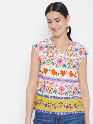 Berrylush Women White & Multicolour Floral Printed V-Neck Cap Sleeve Regular Top